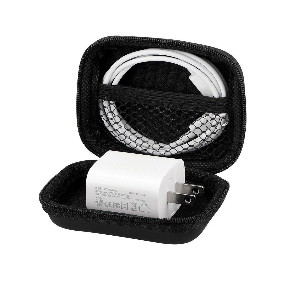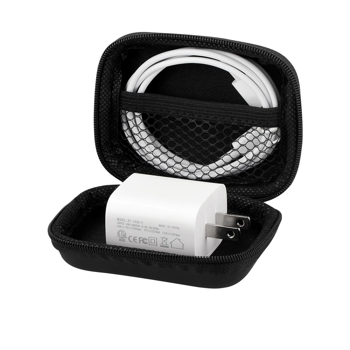 Incluye adaptador de corriente con puerto tipo C de carga rápida de 20W, cable auxiliar con conexión tipo C en ambas puntas y estuche rígido para transportar fácilmente los accesorios.