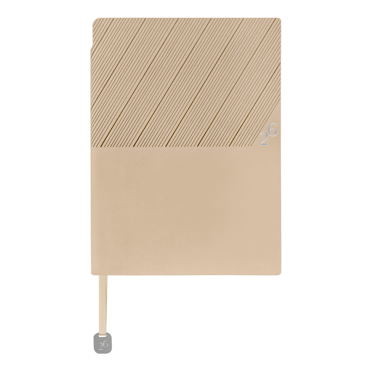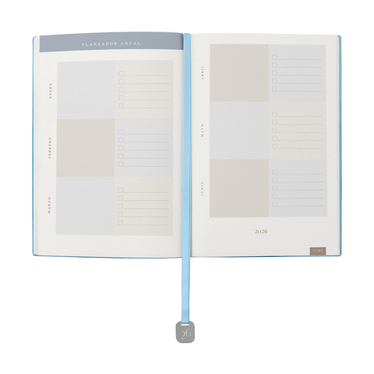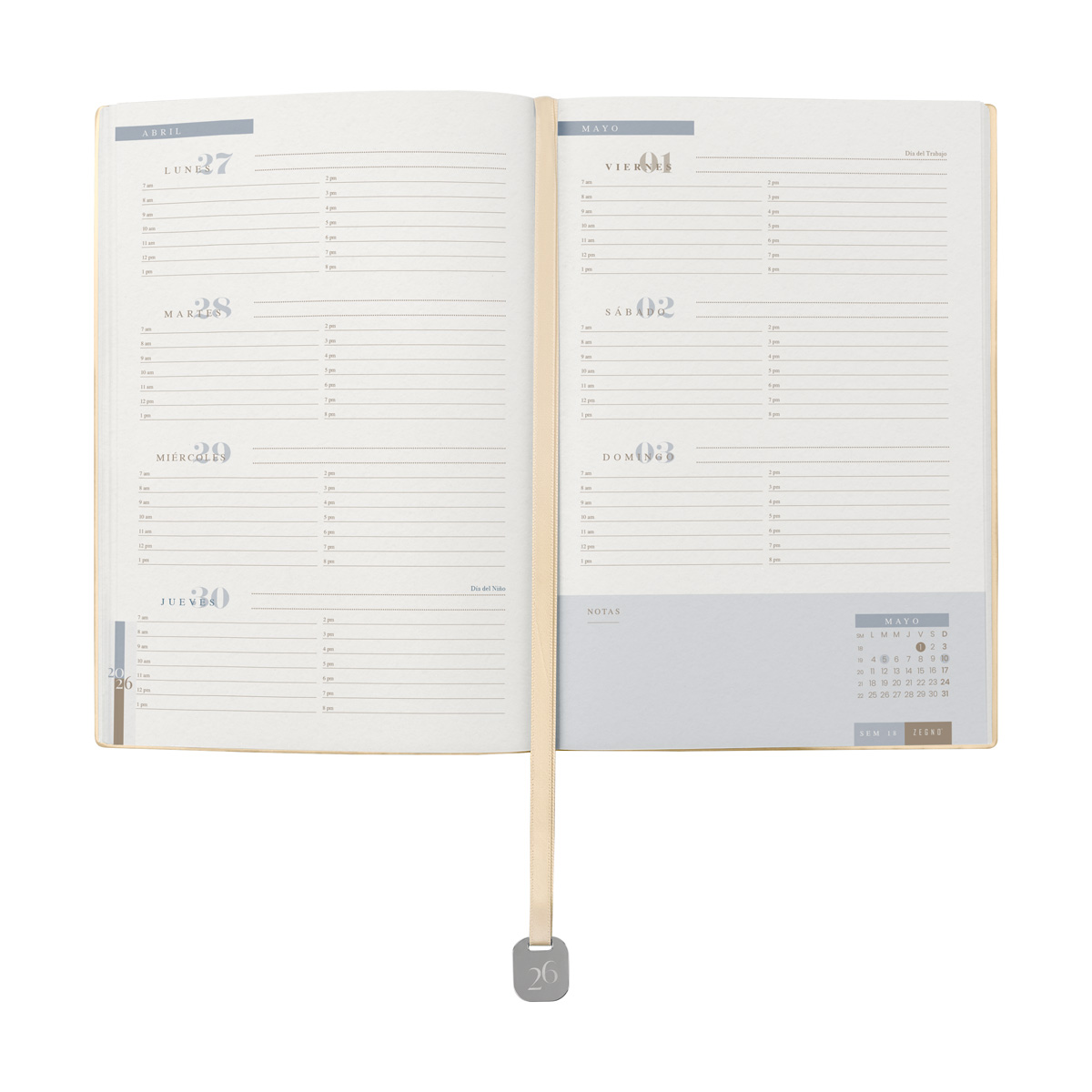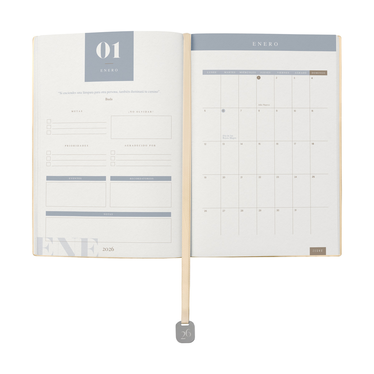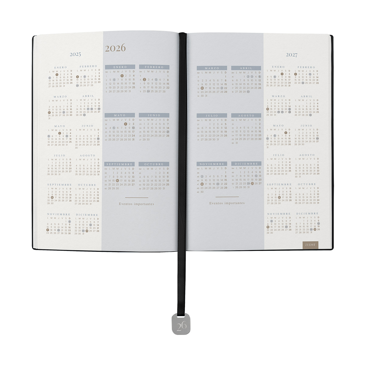 Descripcion: Agenda semanal con 100 hojas. Contiene datos personales, calendarios 2025-2026-2027, planeador 2026, presupuesto de gastos, seguimiento de nuevos hábitos, organizador de tareas, planeador de proyectos y días festivos. Incluye caja individual del mismo color a la agenda, separador con placa metálica y bolígrafo.