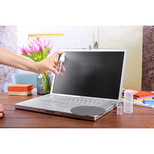 Descripcion: Atomizador con líquido limpia pantallas y microfibra de 12.5 cm de diámetro. El atomizador y la fibra se entregan por separado para su impresión.