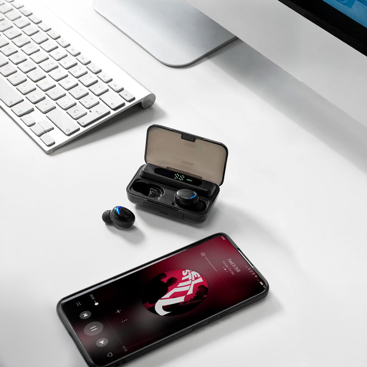 Audífonos bluetooth inalámbricos con power bank de 1,500 mAh. Función manos libres. Rango de conexión 10 metros. Reproducción de música 5 hrs aproximadamente. Incluye cable cargador USB, 4 repuestos de goma y estuche para recargar los audífonos con pantalla digital que indica el nivel de carga del power bank y los audífonos.