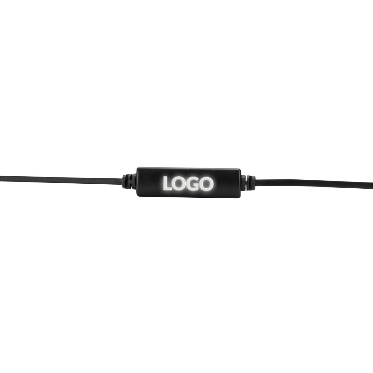 Audífonos bluetooth con batería recargable. Controles integrados de llamada, volumen y reproducción de audio. Reproducción de música hasta 2 hrs aproximadamente. Incluye estuche con cierre y cable cargador USB. Al grabar el logotipo, el control se ilumina al encender.