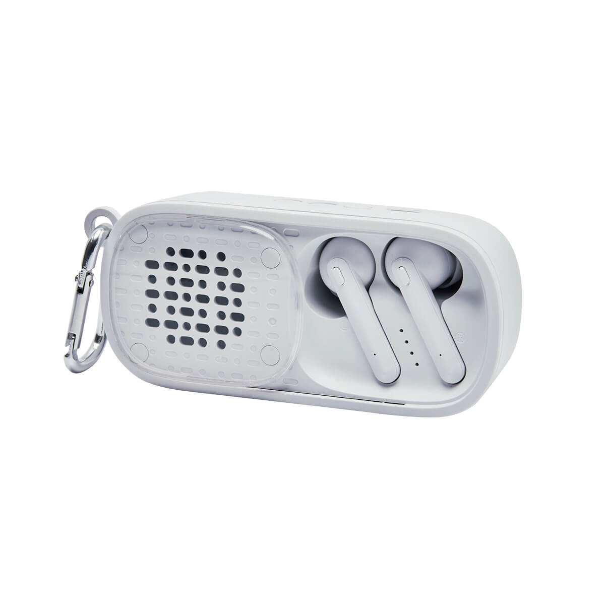 Bocina y audífonos bluetooth con batería recargable. Reproducción de música de 3 hrs aproximadamente. Rango de conexión de 10 metros. Gancho para transportar fácilmente. Incluye cable cargador USB.