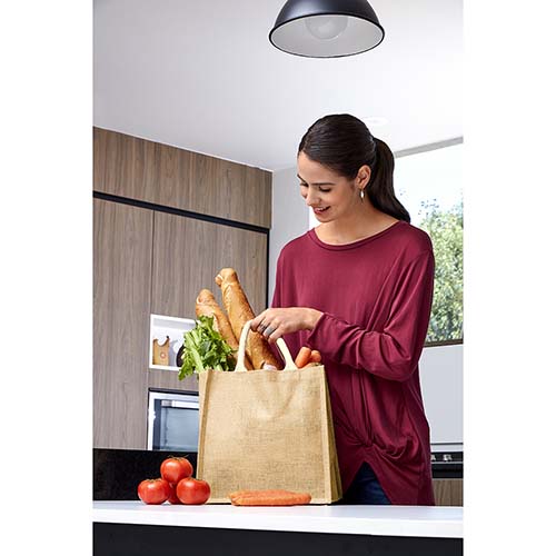 Descripcion: Bolsa con fuelle y asas redondeadas. Interior plastificado. El yute es un producto natural el cual puede presentar variaciones en tonalidades y en la urdimbre y trama de la tela.