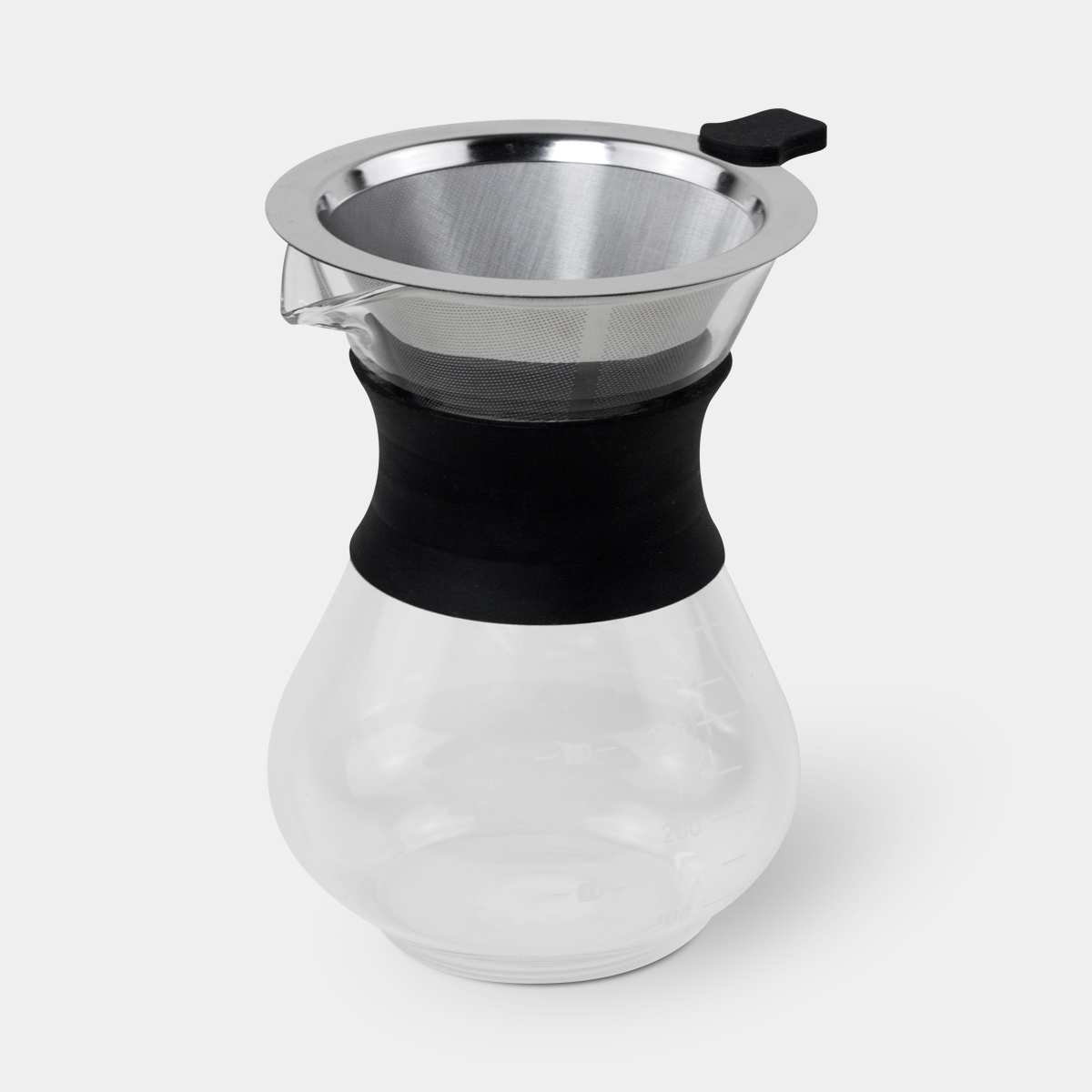 Cafetera de goteo de vidrio con marcador de medición. Incluye filtro en forma de cono de acero inoxidable. Collar de silicon para evitar quemaduras y tener un mejor agarre. Caja individual incluida.