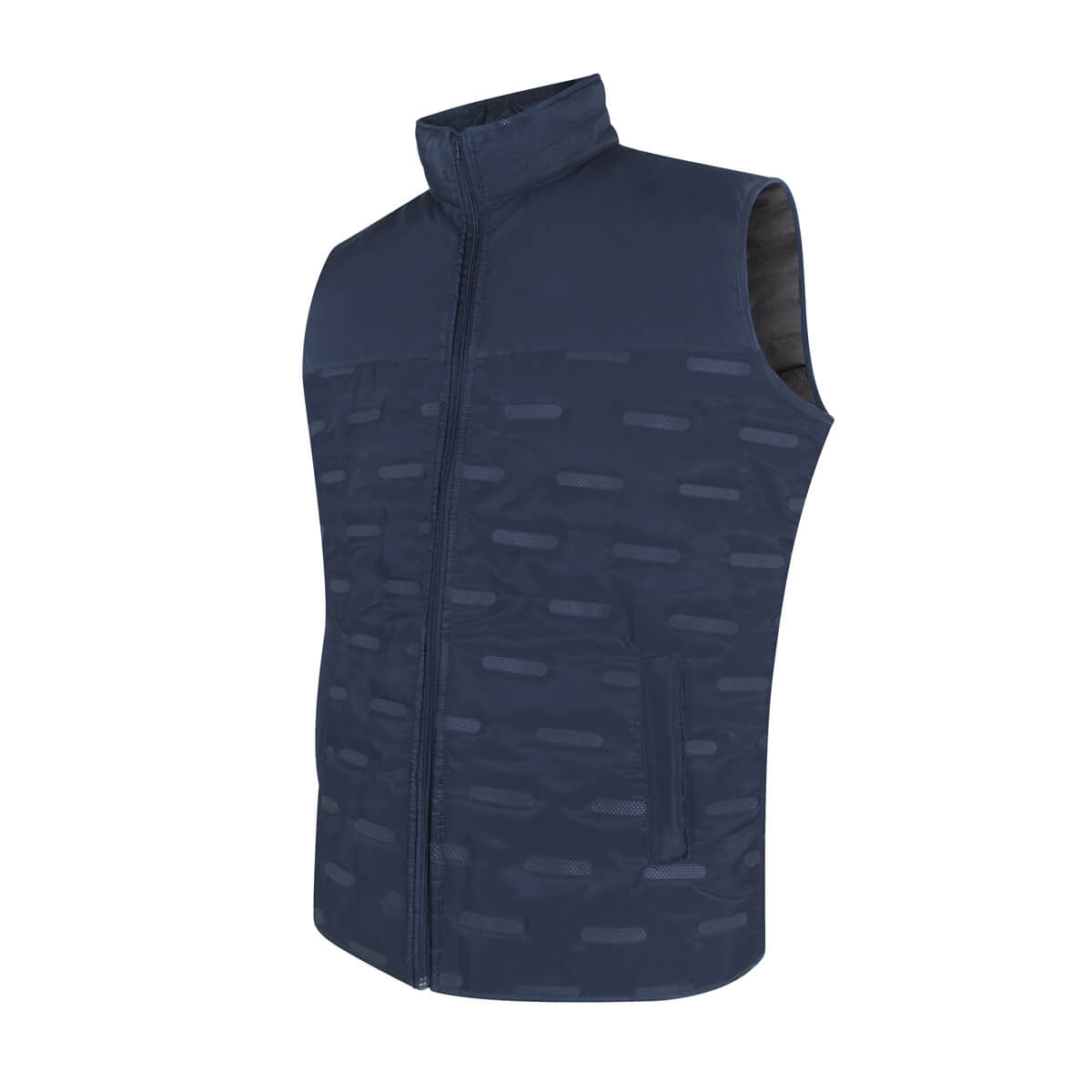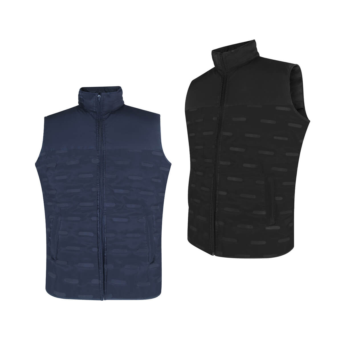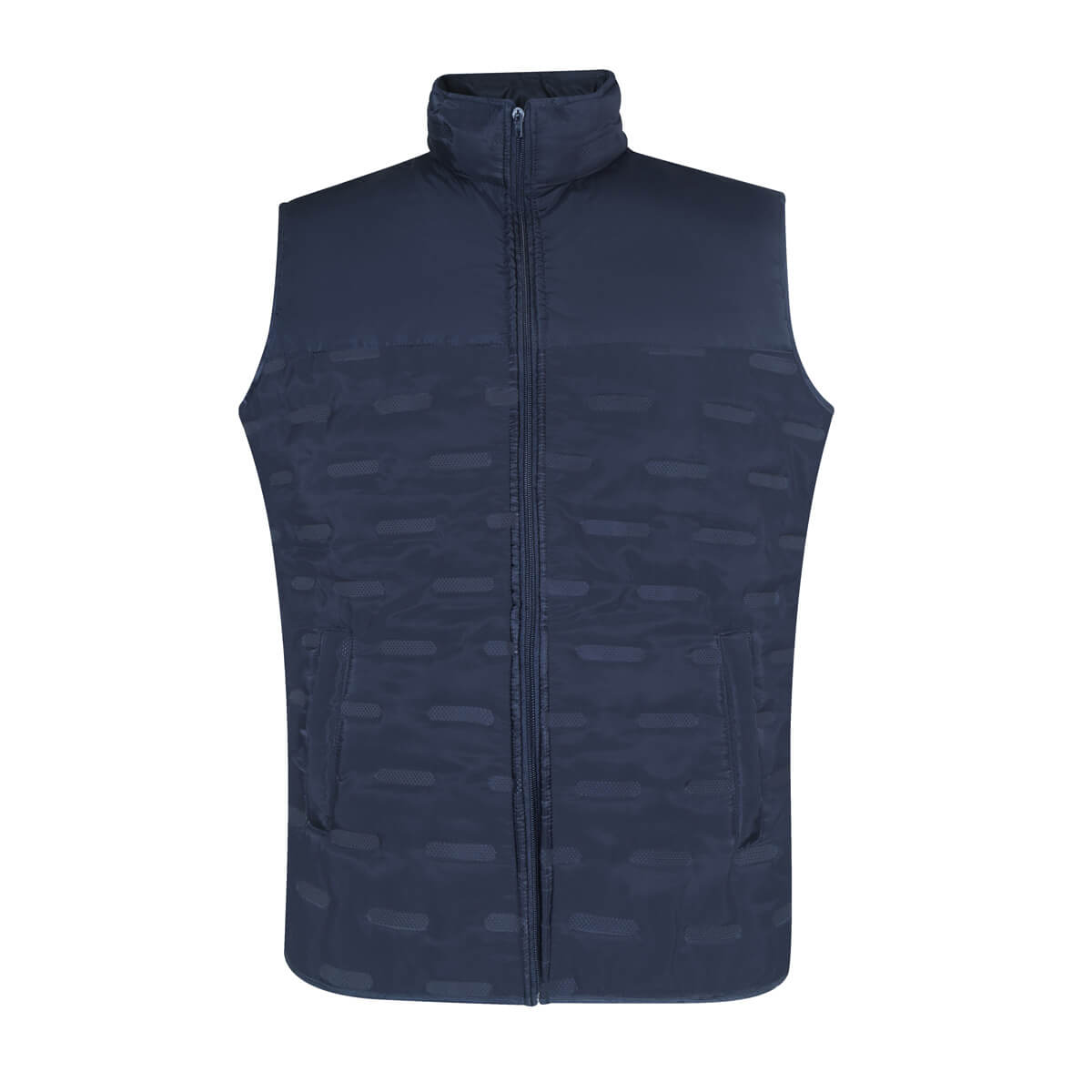 Chaleco con doble bolsa frontal y doble bolsillo interior de cada lado. Combina un diseño moderno con una textura capitonada, que no solo aporta un atractivo visual, sino también una mayor calidez y comodidad. Exterior e interior 100% poliéster.