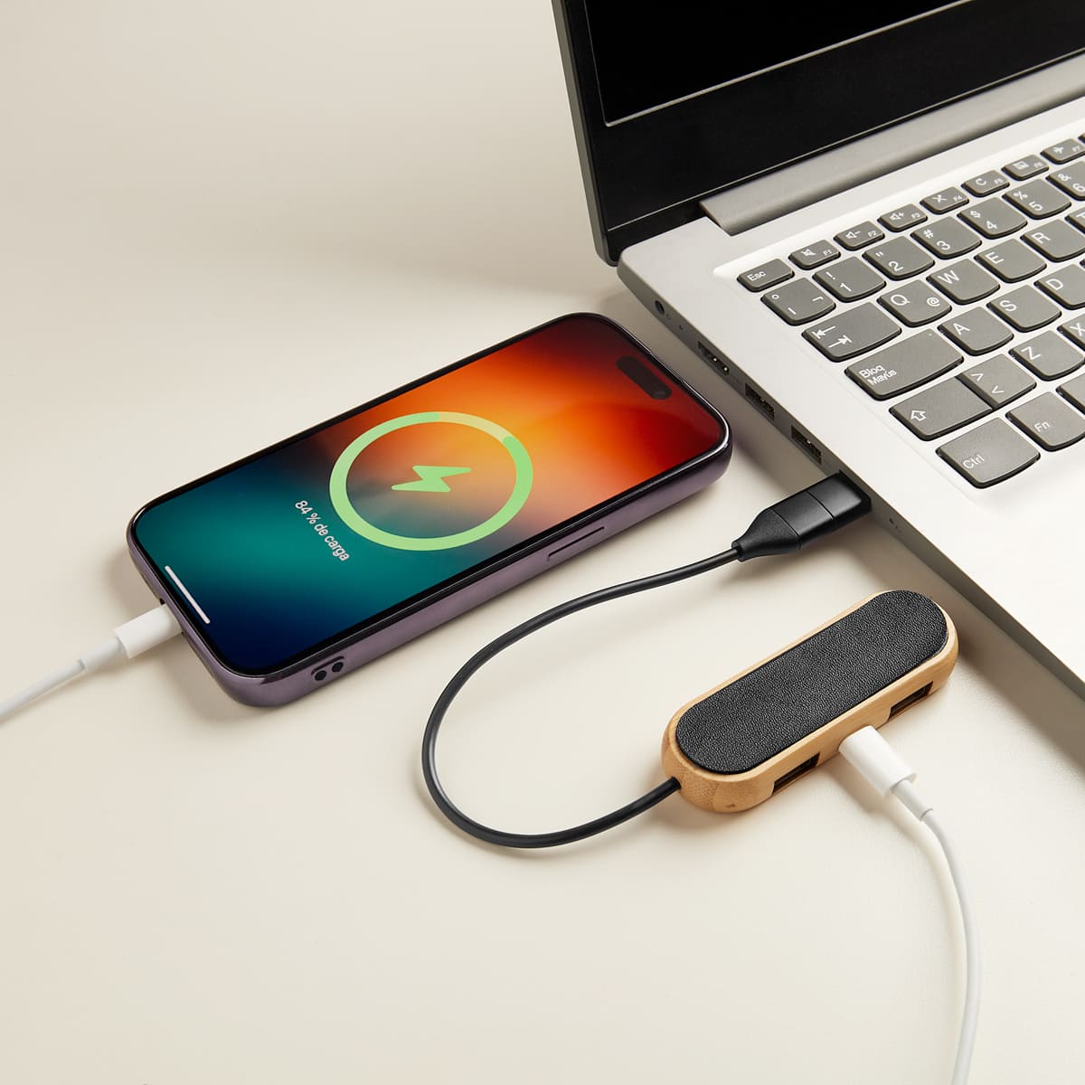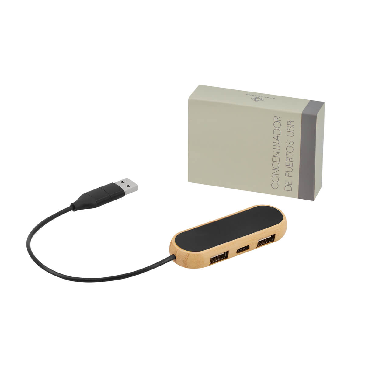 Concentrador con 2 puertos USB 2.0 y 1 puerto tipo C. Soporta transferencia de datos. Cable de conexión con USB y tipo C. El bambú es un producto natural el cual puede presentar variaciones en tonalidades y vetas.