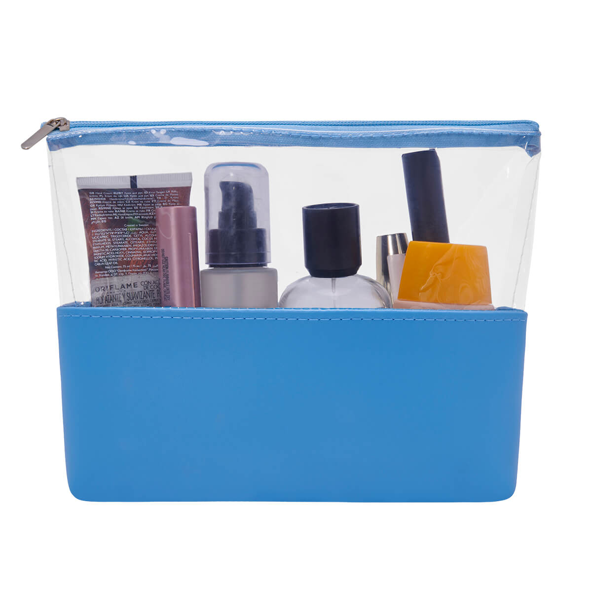 Descripcion: Cosmetiquera con cierre. Diseño combinado de PVC transparente y curpiel de color en base.