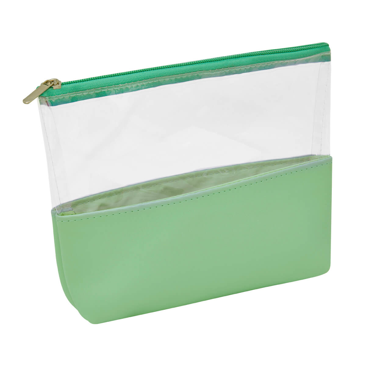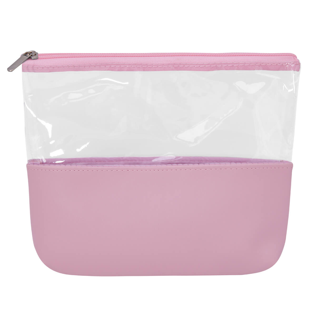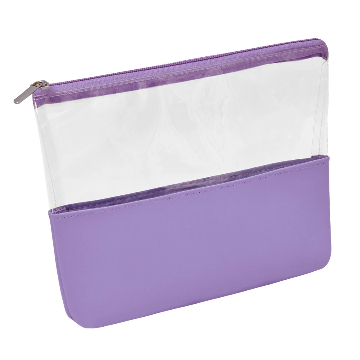 Cosmetiquera con cierre. Diseño combinado de PVC transparente y curpiel de color en base.