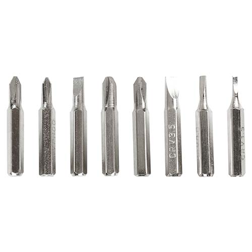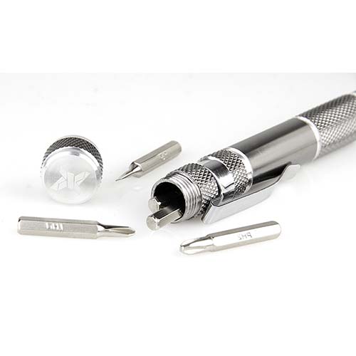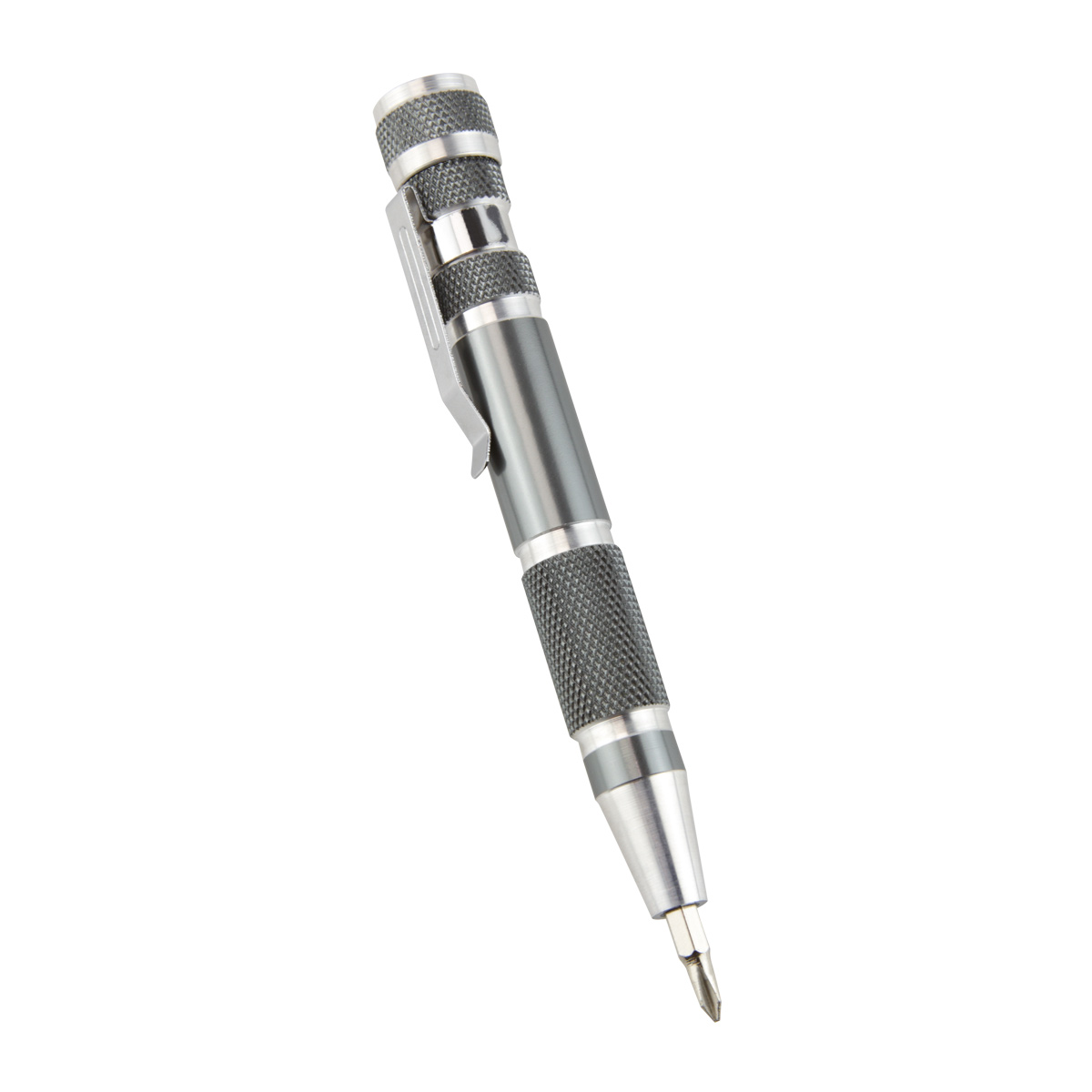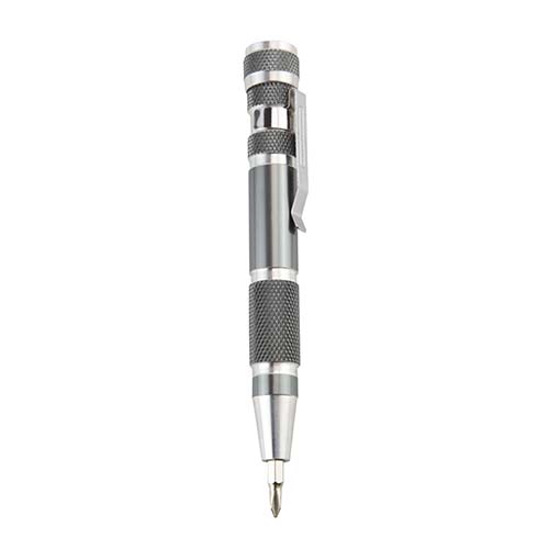 Desarmador de bolsillo con 4 puntas de cruz y 4 puntas planas diferentes e intercambiables. Incluye clip.