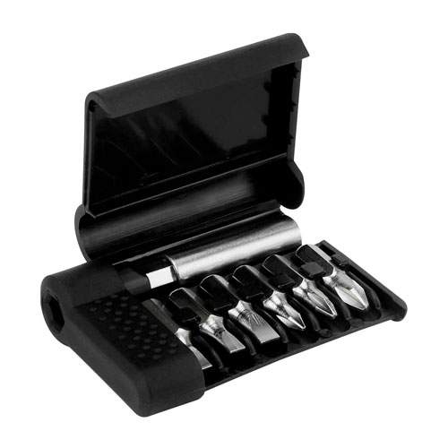 Contiene desarmador con 3 puntas planas, 3 puntas de cruz, diferentes e intercambiables. Incluye extensión.