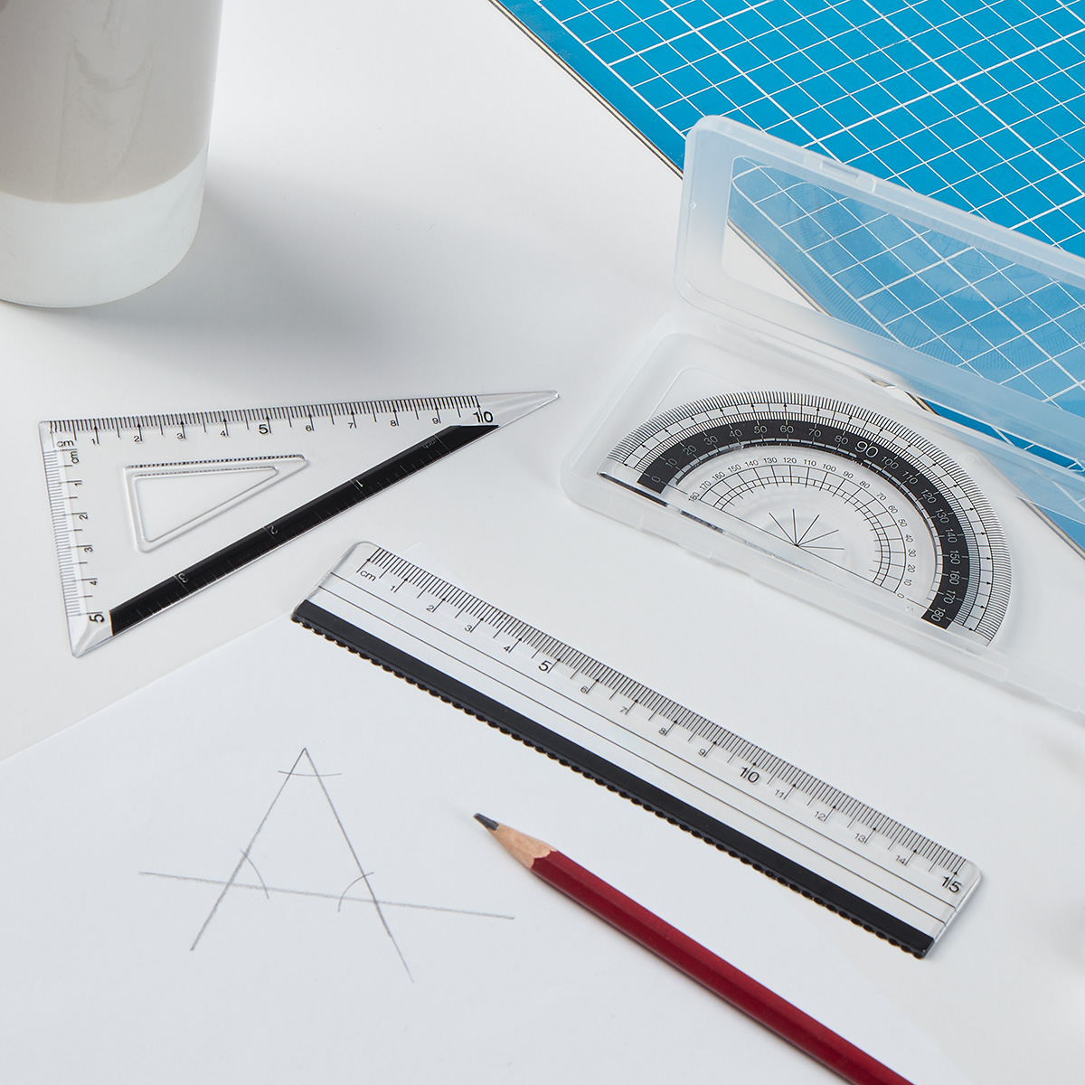 Incluye regla, transportador y escuadra.