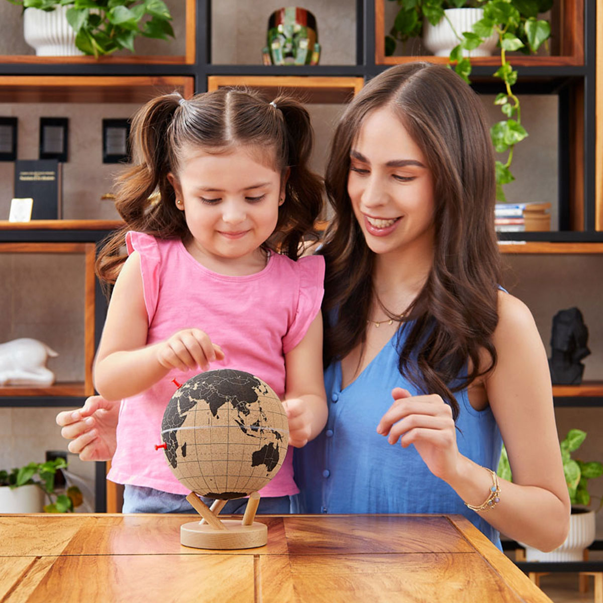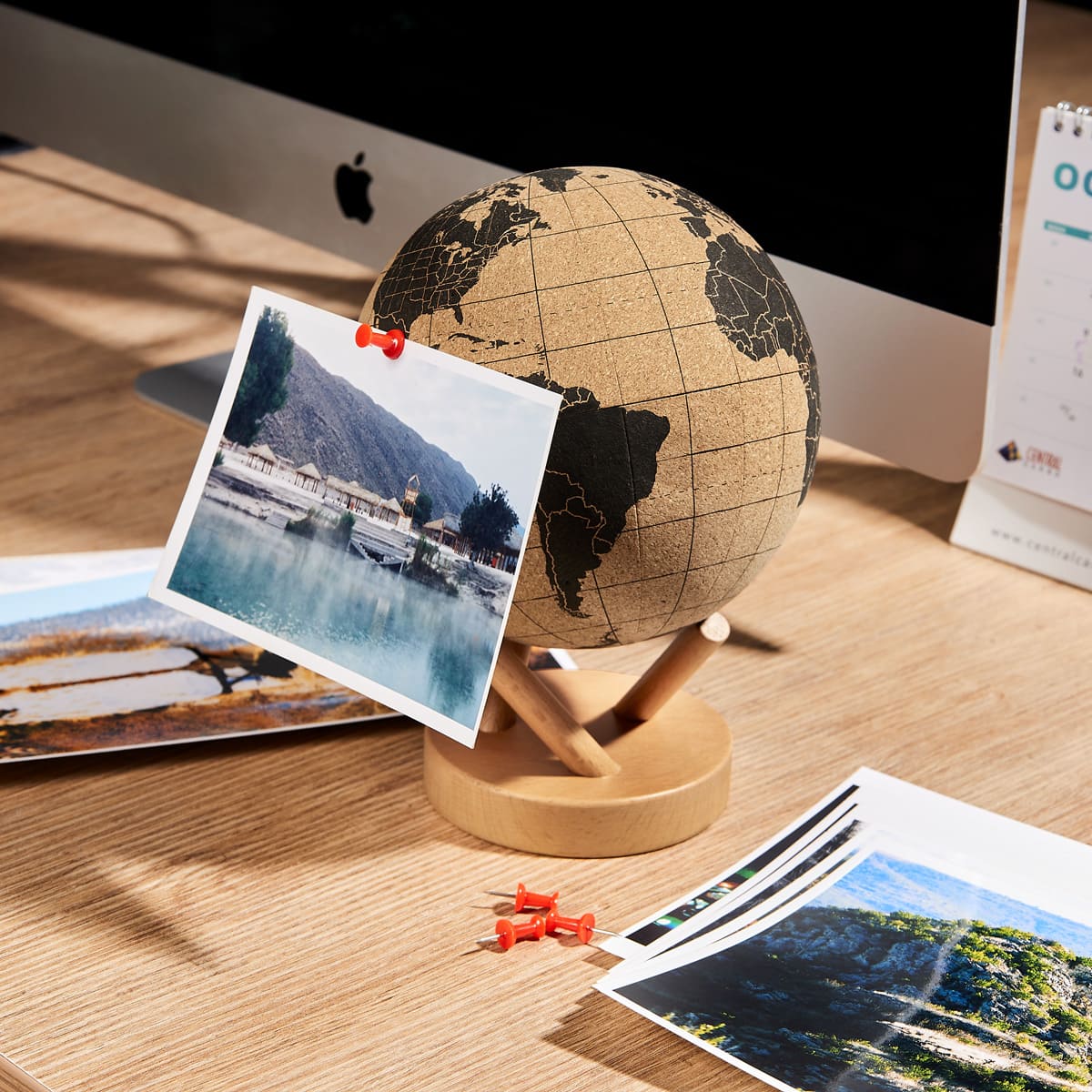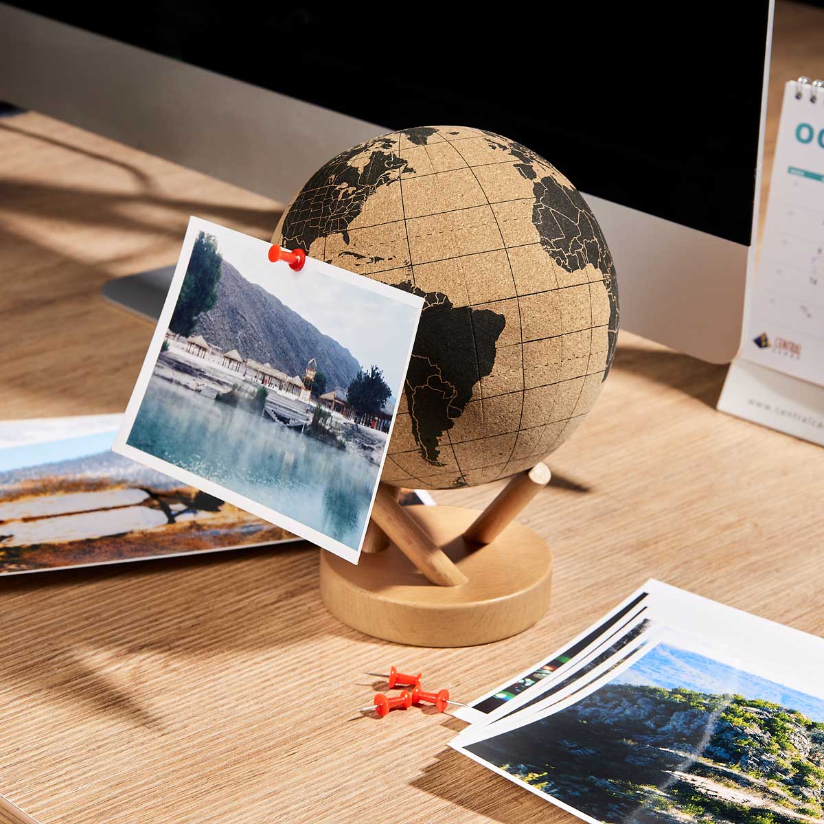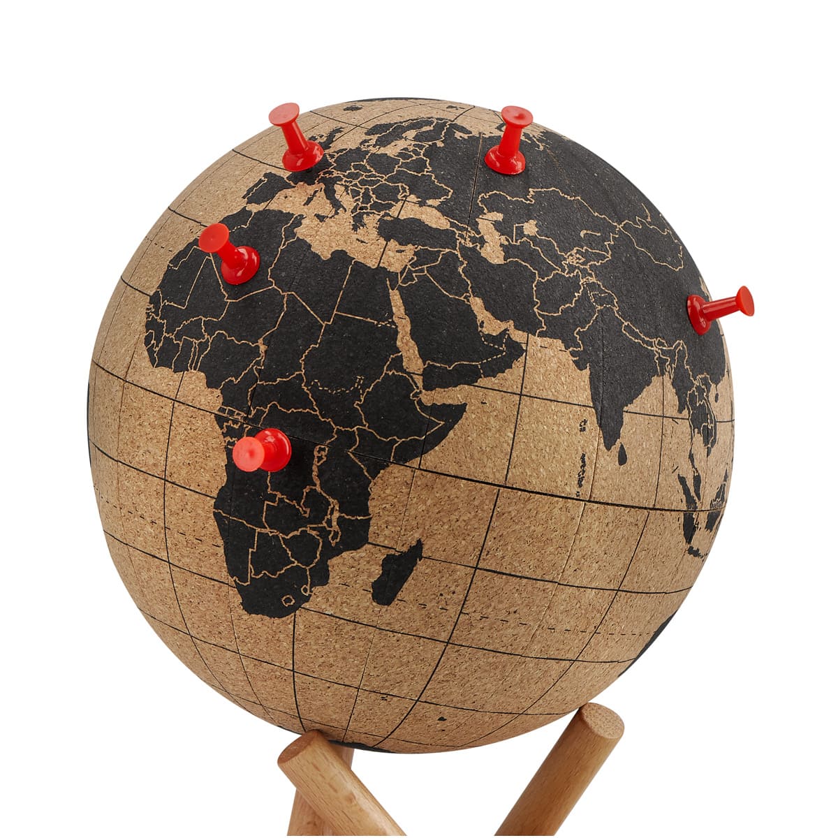 Globo decorativo de corcho con base de madera desmontable. Incluye 6 tachuelas para marcar tus viajes realizados o para utilizar con fines educativos.