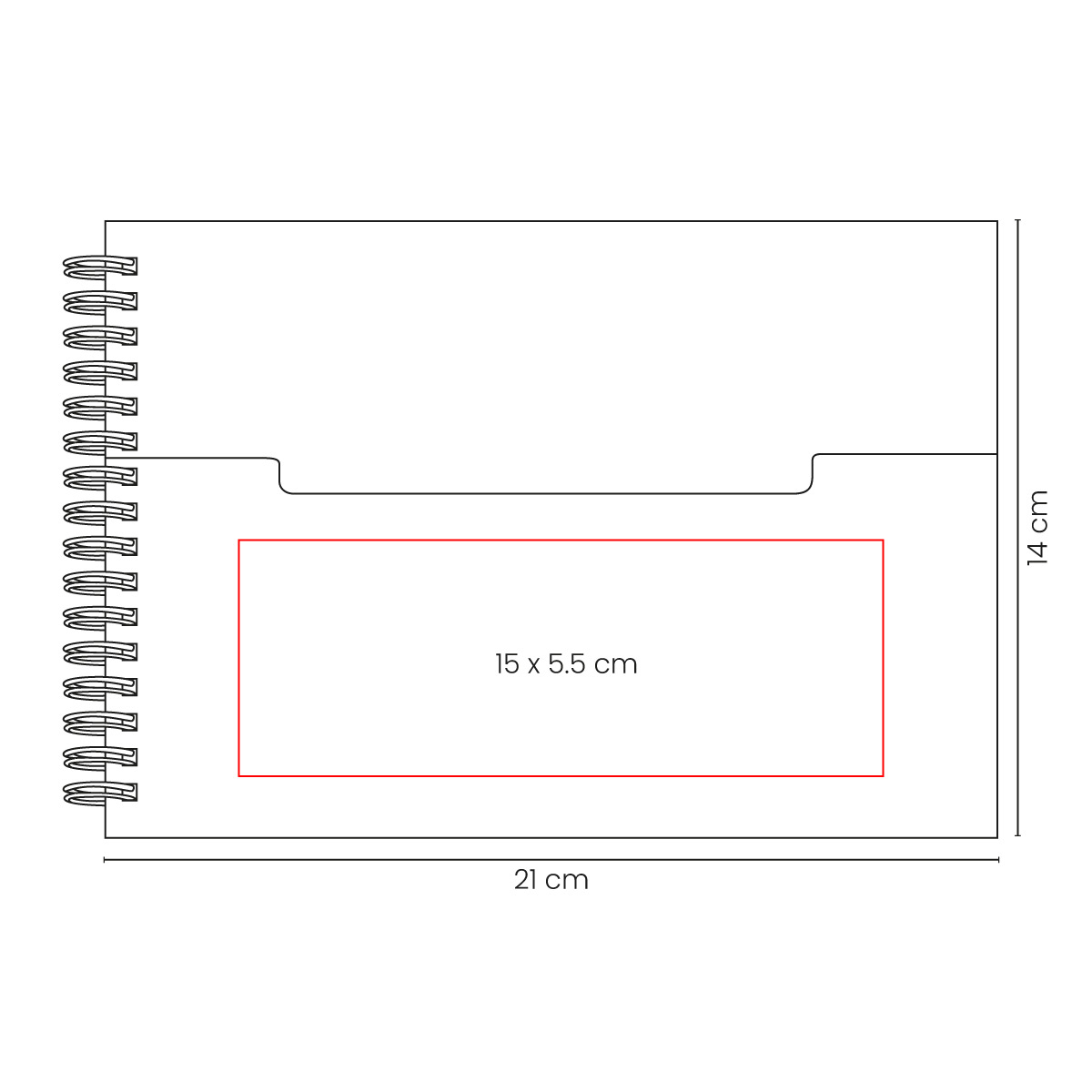 Descripcion: Libreta de espiral con 80 hojas a rayas. Cubierta de cartón y bolsillo frontal para llevar pequeños documentos. Fabricada con papel de algodón, es una opción ecológica y respetuosa con el medio ambiente. Su formato horizontal, la hace diferente y práctica para llevar tus notas.