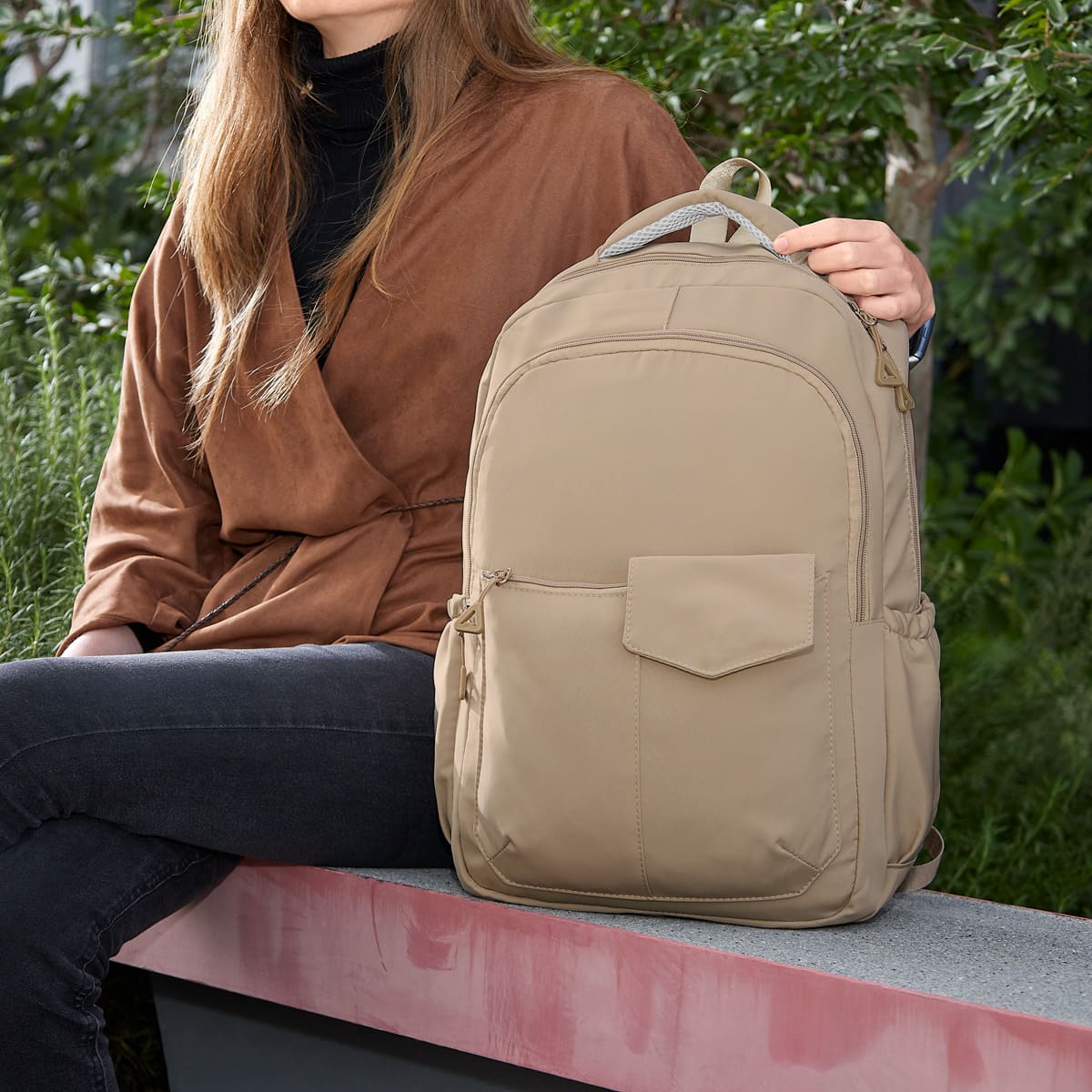 Mochila estilo casual. Su bolsa principal cuenta con un compartimento especial para laptop de hasta 15″, además incluye bolsillos organizadores para mantener tus objetos personales ordenados y al alcance de tu mano. Al frente tiene dos bolsos con cierre y una solapa decorativa con broche magnético que le añade un toque de elegancia y practicidad. También cuenta con dos bolsillos laterales para llevar botellas u otros artículos esenciales. Su asa superior te permite llevarla cómodamente; mientras que las asas para hombro acolchadas ofrecen un soporte ergonómico.