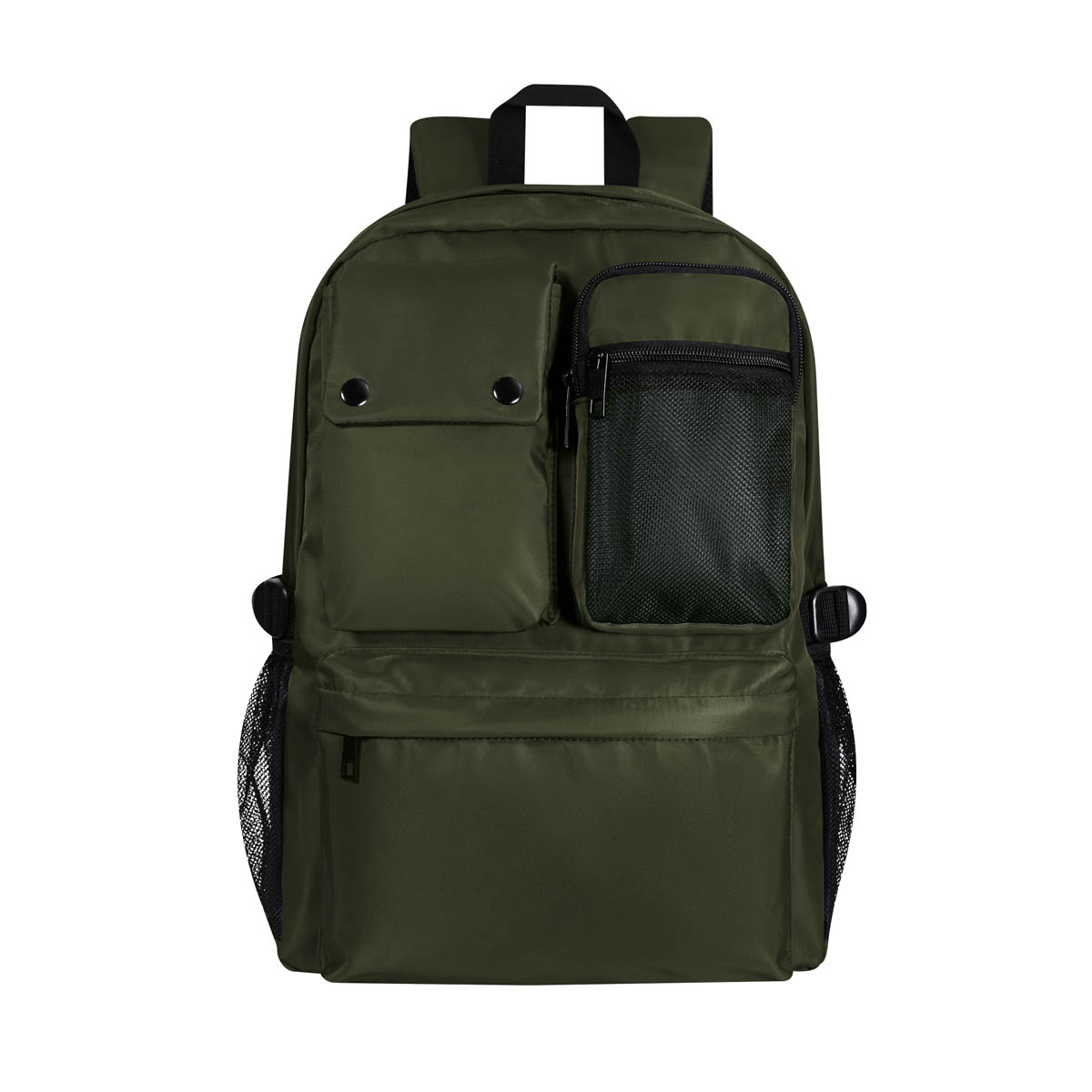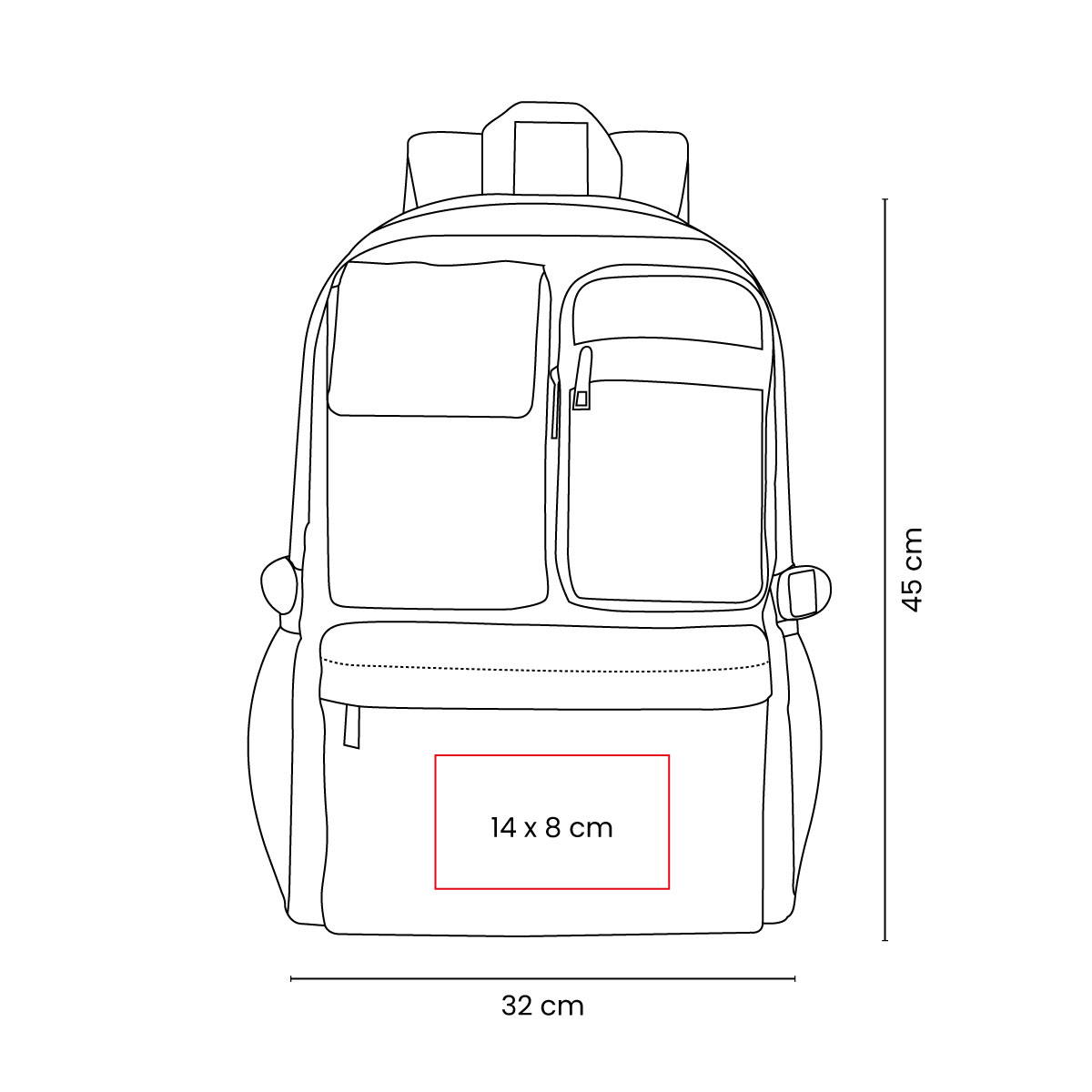 Mochila con amplia bolsa principal con compartimento interno para laptop de hasta 15” y dos bolsas internas. Cuenta con 3 bolsillos frontales, dos de ellos con cierre y uno con sistema de botones. Tiene un par de ajustadores expandibles y laterales de malla.