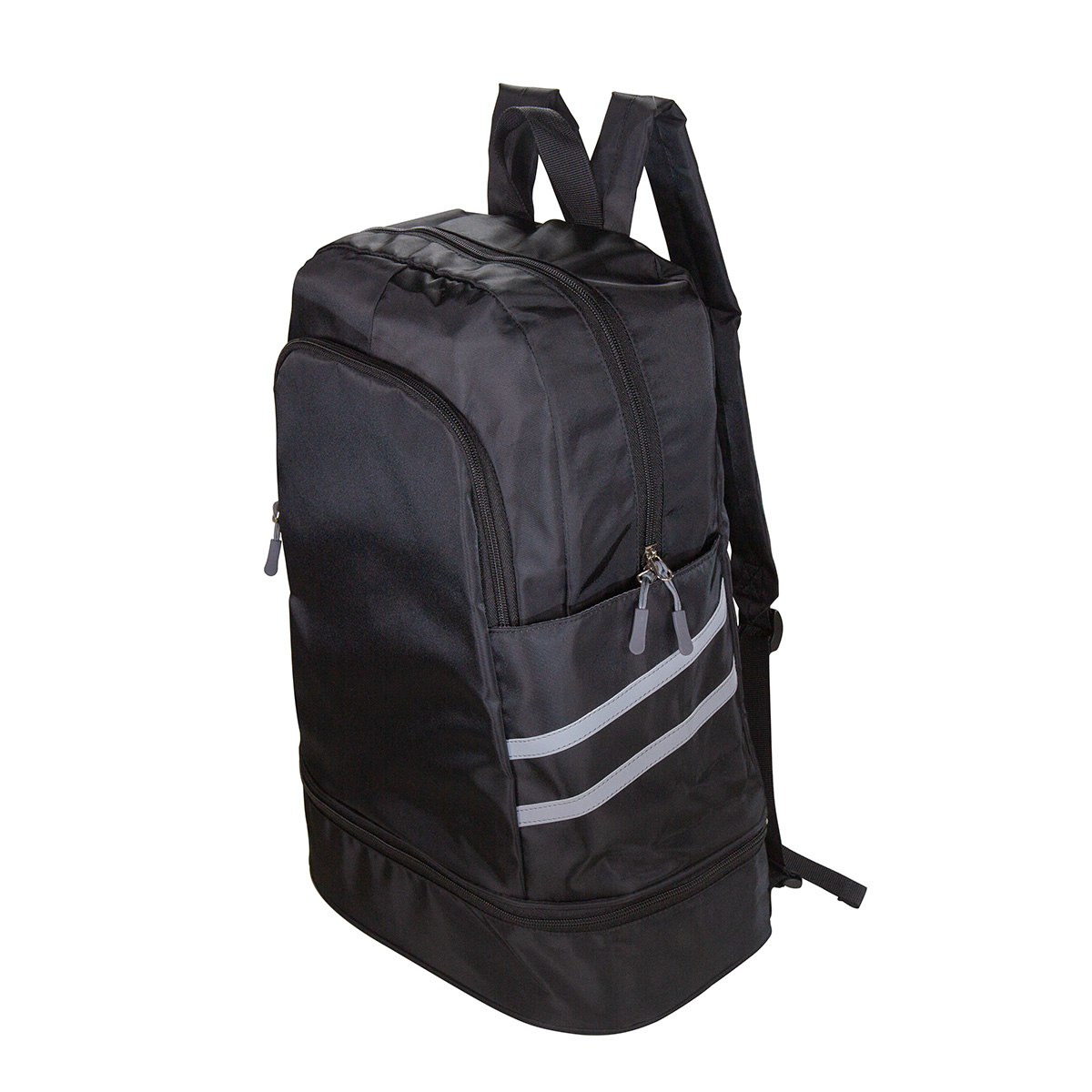 Mochila tipo deportiva, para un estilo de vida activo. Su diseño cuenta con un compartimento principal equipado con separación de malla, y dos pequeños bolsillos para objetos pequeños. El bolsillo frontal con forro impermeable permite separar prendas mojadas del resto del interior. Cuenta también con dos bolsillos laterales para un acceso rápido y práctico, así como un compartimento inferior, ideal para calzado. En la parte trasera, tiene un mini bolsillo especial para objetos de valor o muy pequeños.