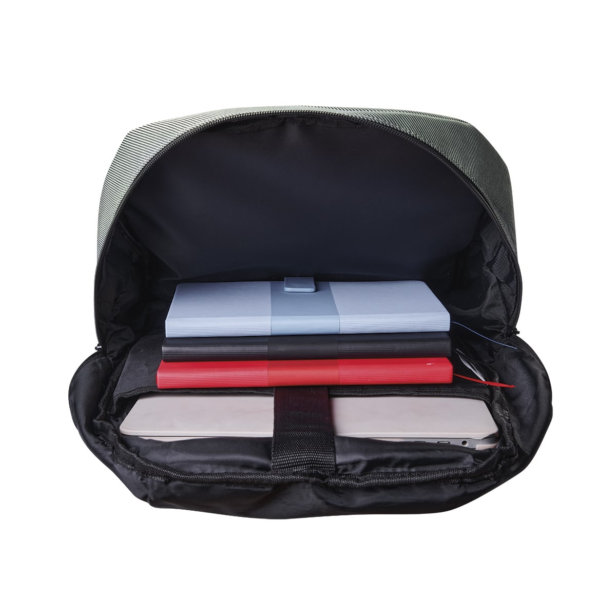 Descripcion: Mochila con salida USB (se requiere conectar a batería portátil) para cargar smartphone. Compartimento interno para laptop de 16" y tablet, organizador de documentos, bolsa frontal inclinada con cierre y bolsa con cierre con tira reflejante, 2 bolsas laterales de red, aditamento especial trasero para poner en trolley, respaldo y tirantes acojinados. Incluye placa metálica removible para grabado láser.