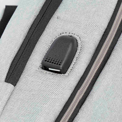Descripcion: Mochila con salida USB (se requiere conectar a batería portátil) para cargar smartphone. Compartimento interno para laptop de 16" y tablet, organizador de documentos, bolsa frontal inclinada con cierre y bolsa con cierre con tira reflejante, 2 bolsas laterales de red, aditamento especial trasero para poner en trolley, respaldo y tirantes acojinados. Incluye placa metálica removible para grabado láser.