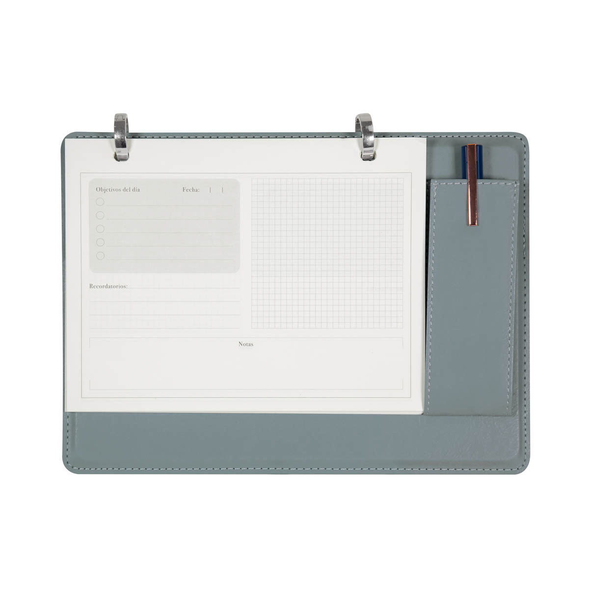 Planeador semanal con diseño plegable. Cubierta de curpiel y dos aros metálicos. Incluye 40 hojas reticuladas y dos blocks de 25 notas cada uno, además de 5 colores diferentes de banderines con 25 notas cada uno y un porta plumas. Su diseño permite desplegarlo para tener tus apuntes a la vista y organizar tus tareas diarias fácilmente.