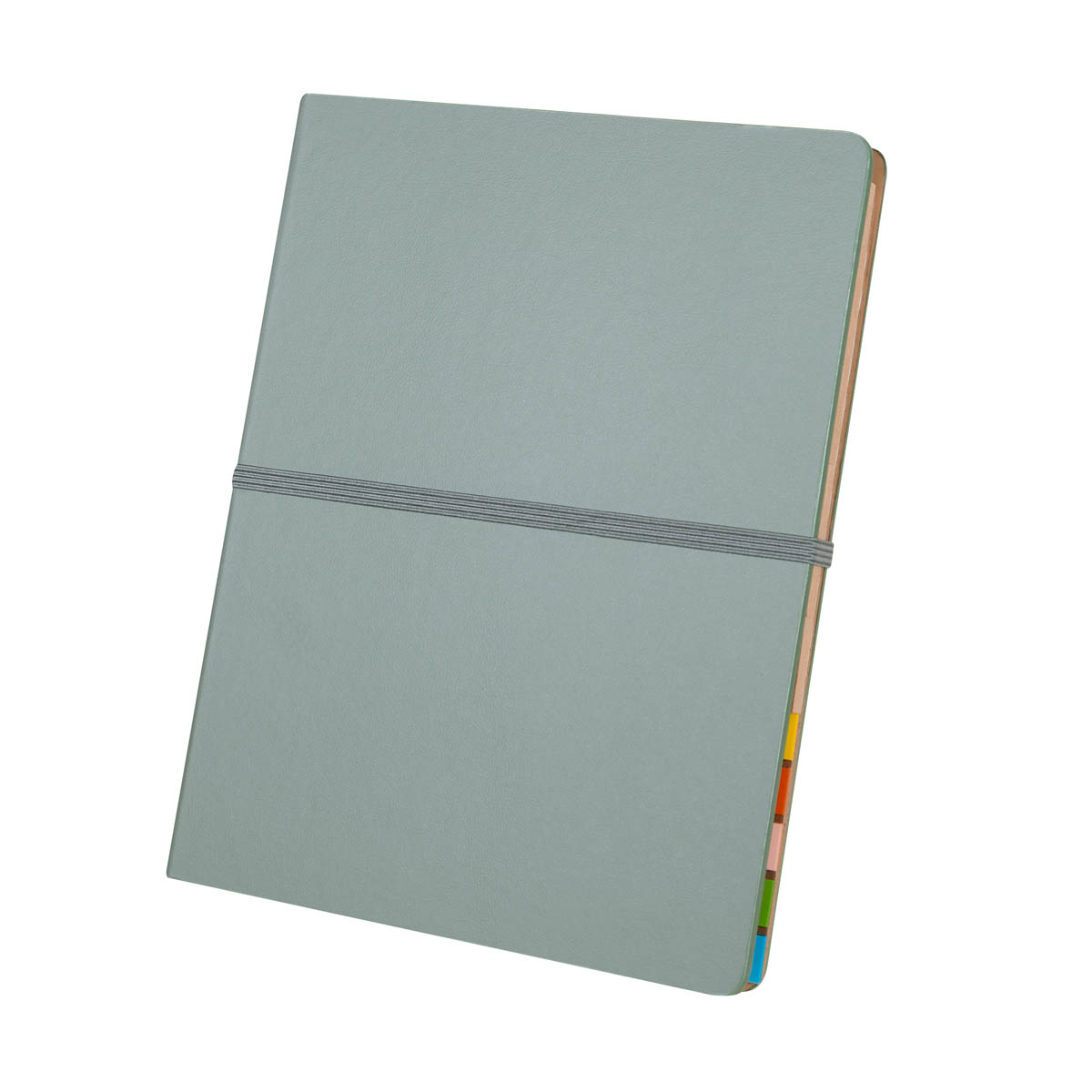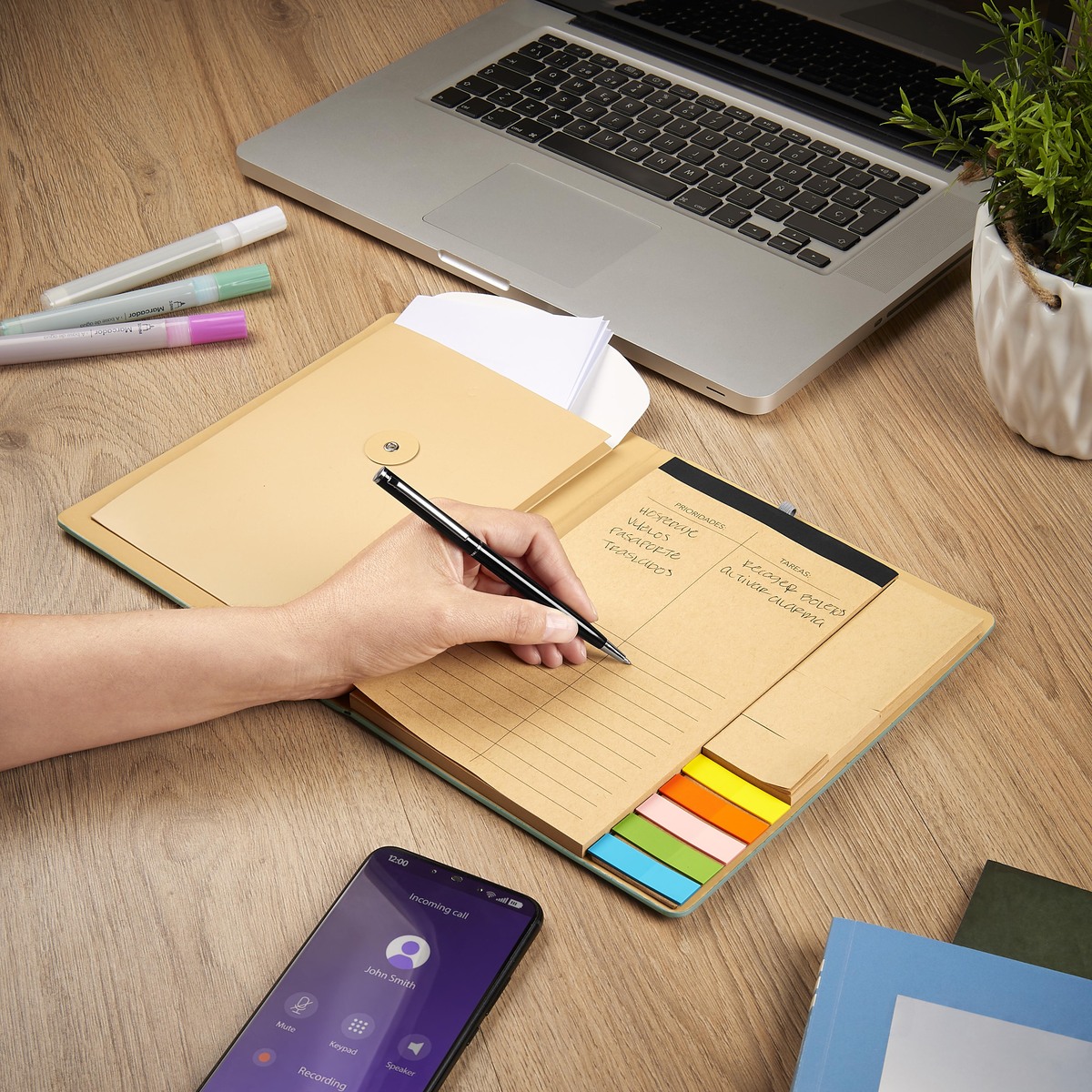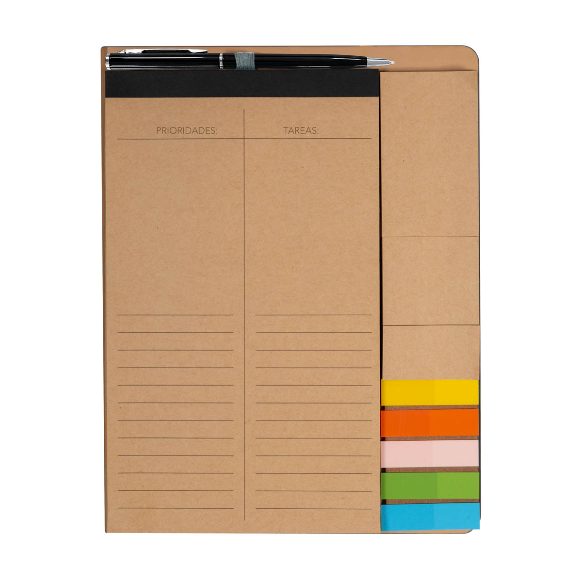 Planeador de prioridades y tareas. En su interior incluye un bolígrafo metálico, un sobre de papel para almacenar o proteger documentos, un block de 70 hojas de papel Kraft con diseño de raya, 3 mini notas adhesivas y banderines adhesivos en cinco colores diferentes, con 25 piezas cada uno. Se mantiene cerrado de manera segura gracias a su banda elástica. Cubierta rígida al exterior.