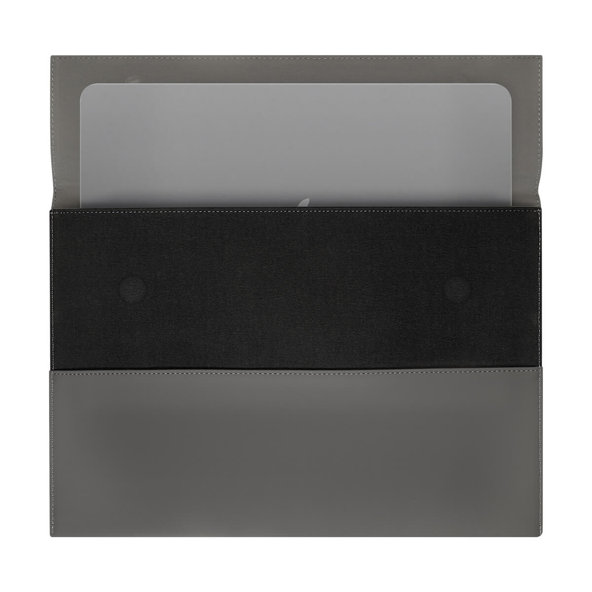 Descripcion: Funda para laptop de hasta 15". Su diseño se dobla ingeniosamente para convertirse en un soporte ergonómico, permitiéndote trabajar de manera más cómoda en cualquier lugar. El cierre con solapa magnética asegura un acceso rápido y fácil, mientras que el interior aterciopelado brinda un extra de cuidado, manteniendo tu dispositivo libre de rayones. Por su diseño compacto y ligero es perfecto para llevar en cualquier bolso o mochila.