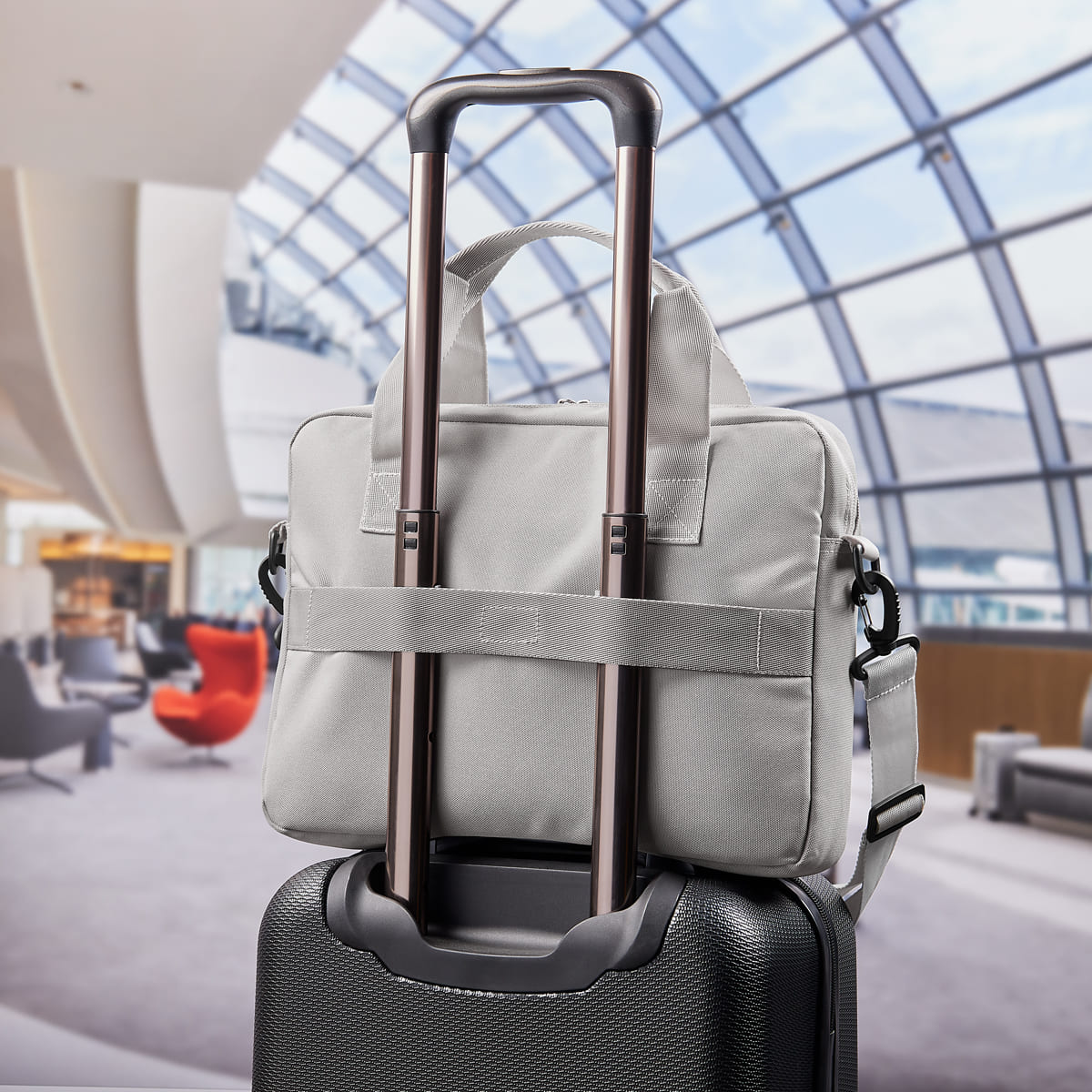 Portafolio para laptop de 15″. Al interior cuenta con organizador que permite mantener documentos, bolí­grafos y otros objetos pequeños. Bolsa principal y bolsillo frontal con cierre. Incluye aditamento trasero para colocar en trolley, correa ajustable removible para hombro y asas superiores. Ideal para el trabajo o viajes de negocios.