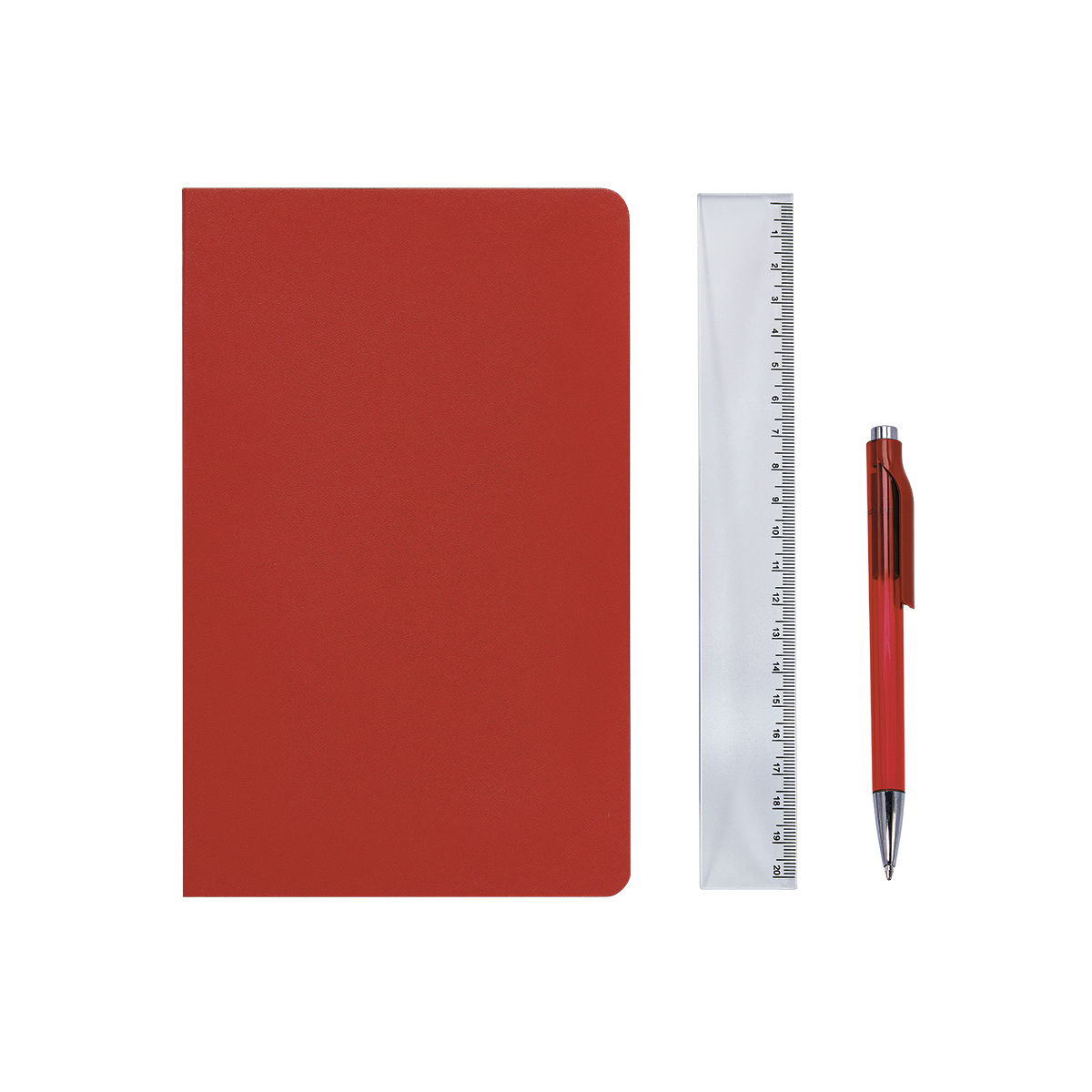 Set que incluye libreta con 64 hojas a rayas, bolígrafo tinta negra, regla de 20 cm y bolsa con cierre zip.