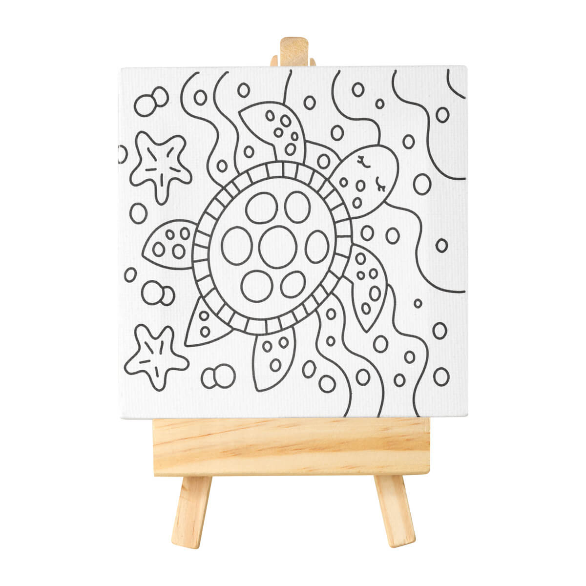 Set de pintura con lienzo que incluye un dibujo prediseñado, listo para que los niños lo pinten y le den vida con su creatividad. También cuenta con un caballete de madera, dos pinceles y una paleta de pinturas con 6 colores diferentes. Ideal para introducir a los niños al mundo del arte de manera simple y entretenida.