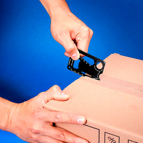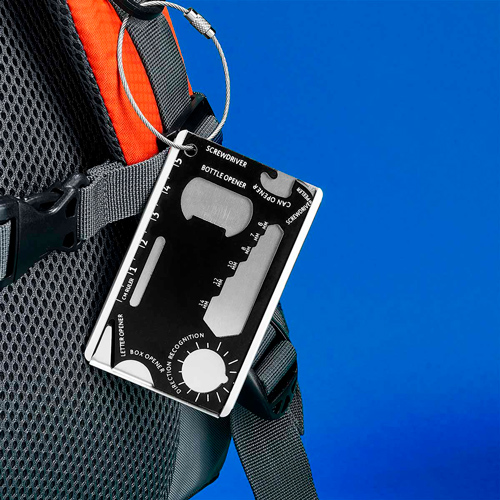 Descripcion: Tarjeta multiherramientas con función de desarmador, abrecartas, abrelatas, destapador, llave inglesa, regla y pelador. Incluye aro para llavero.