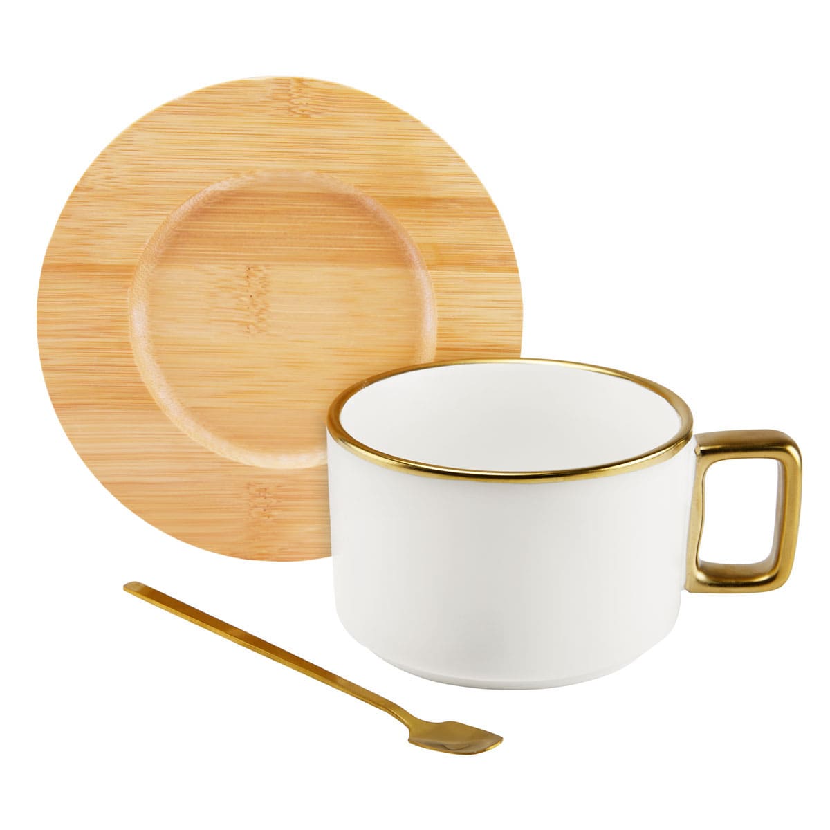 Taza de cerámica con base de bambú y cuchara metálica dorada. Terminado mate con detalle dorado en filo y asa. Incluye caja individual. El bambú es un producto natural el cual puede presentar variaciones en tonalidades y vetas.