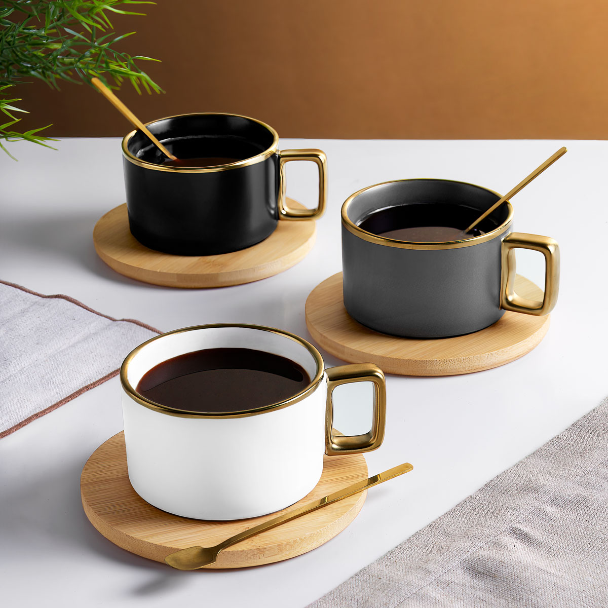 Descripcion: Taza de cerámica con base de bambú y cuchara metálica dorada. Terminado mate con detalle dorado en filo y asa. Incluye caja individual. El bambú es un producto natural el cual puede presentar variaciones en tonalidades y vetas.