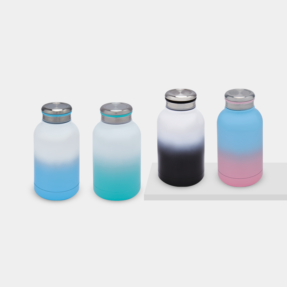 Descripcion: Mini termo color degradado. Doble pared. Cerrado al vacío. Pared interna y externa de acero inoxidable. Mantiene temperatura caliente 6 hrs y temperatura fría 8 hrs aproximadamente. Tapa con sistema de rosca. El termo es pintado a mano, por lo que el color y degradado pueden variar. Incluye caja individual.