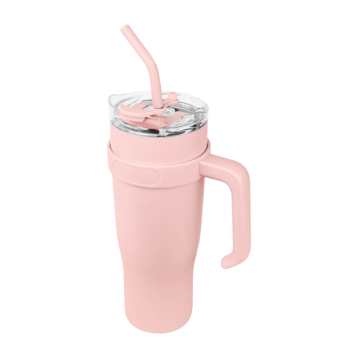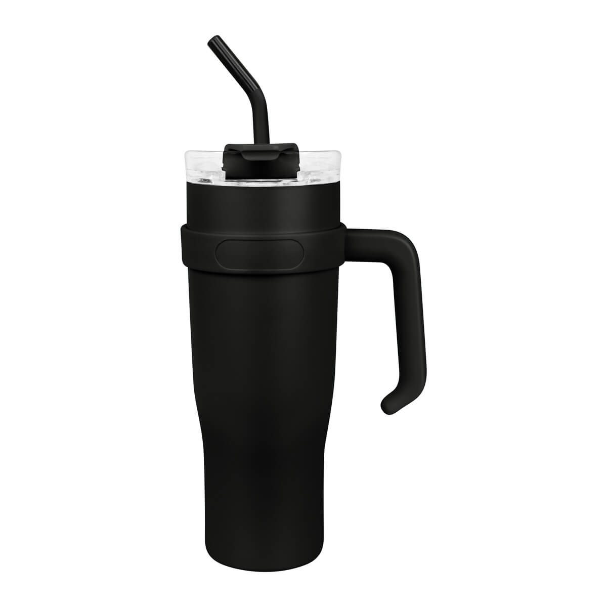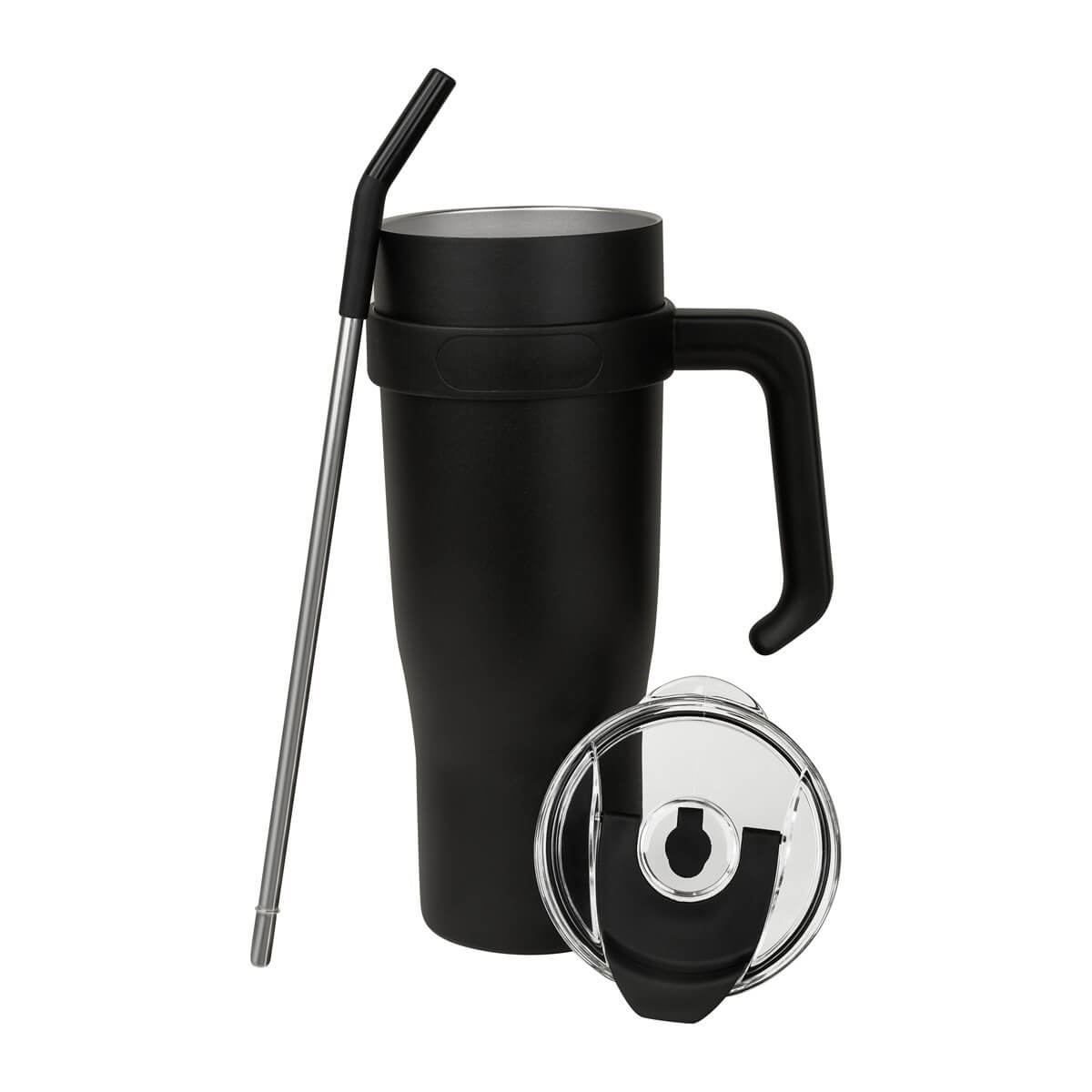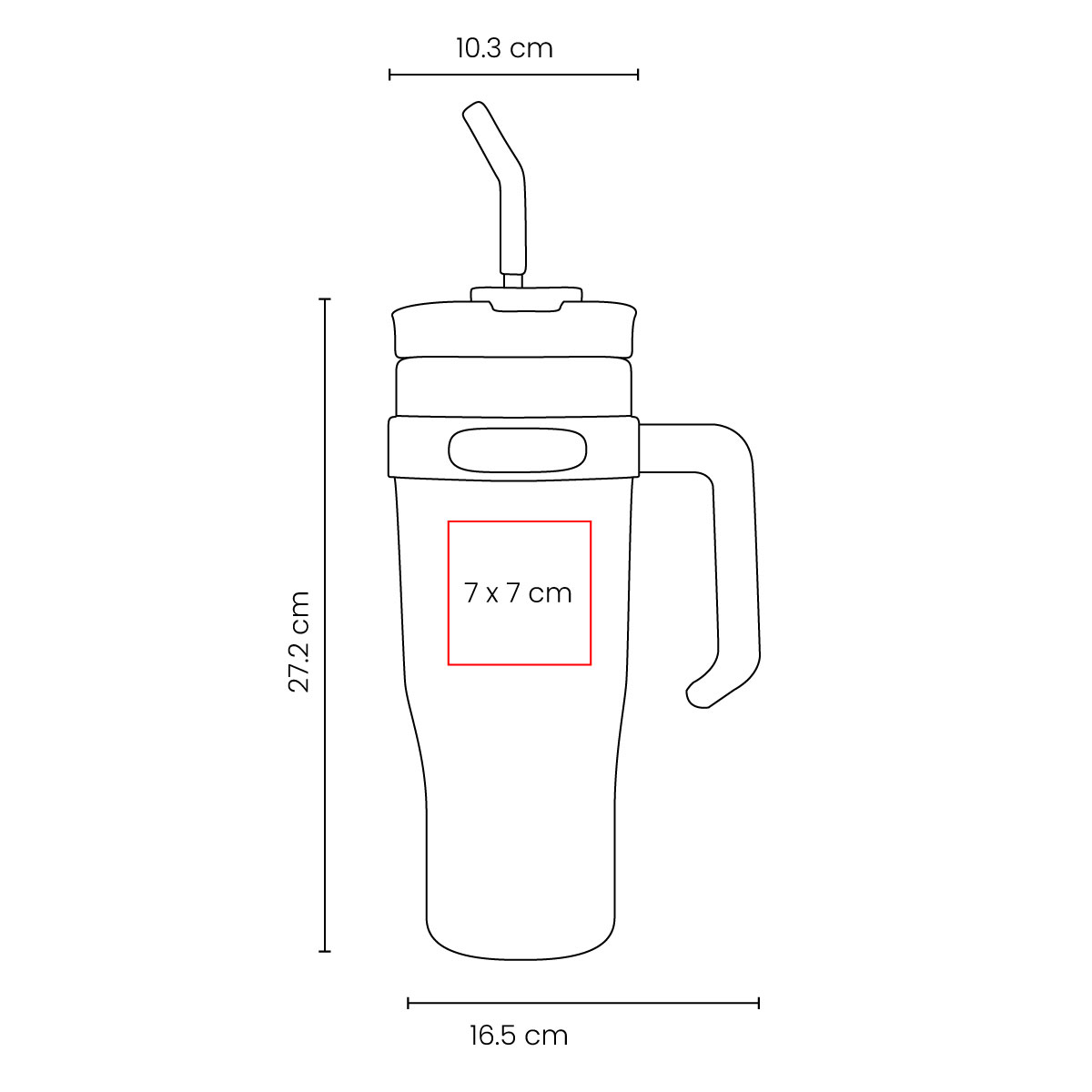 Termo doble pared. Cerrado al vacío. Pared interna y externa acero inoxidable. Cuerpo con terminado rugoso. Tapa de plástico y sobretapa con sistema push, incluye una ranura para popote con tapón de silicón. Su cuerpo de amplia capacidad lo hace perfecto para compartir o disfrutar de varias tazas de tu bebida favorita, además su asa ergonómica permite un transporte fácil y cómodo. Mantiene la temperatura caliente por 12 hrs y la temperatura fría por 20 hrs. Capacidad de 40 Oz. Base de 8.2 cm de diámetro. Incluye popote metálico con boquilla de silicón y caja individual.