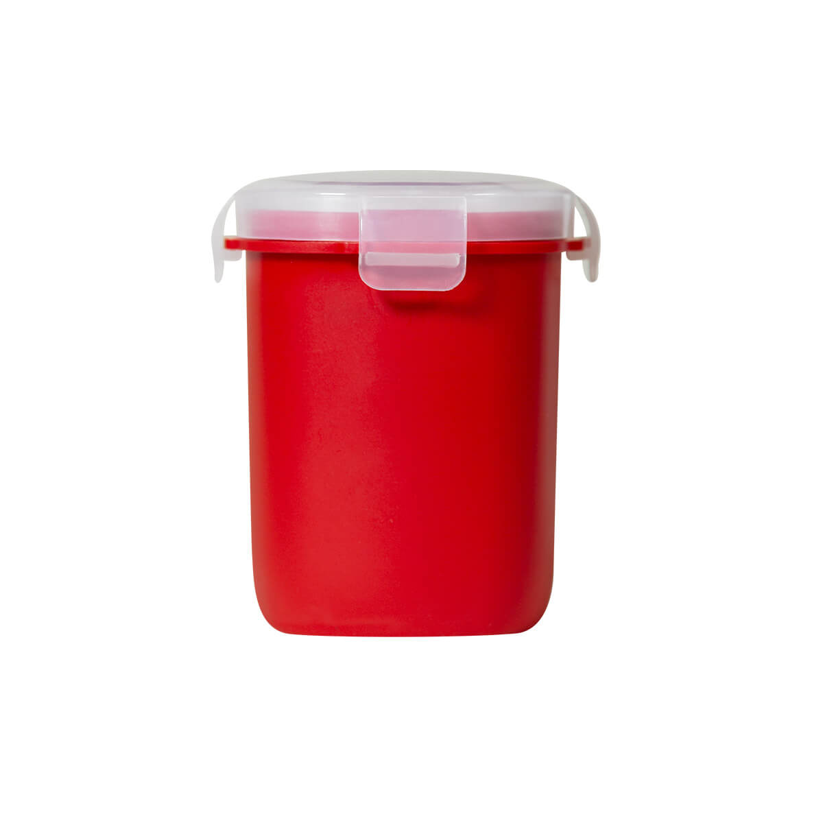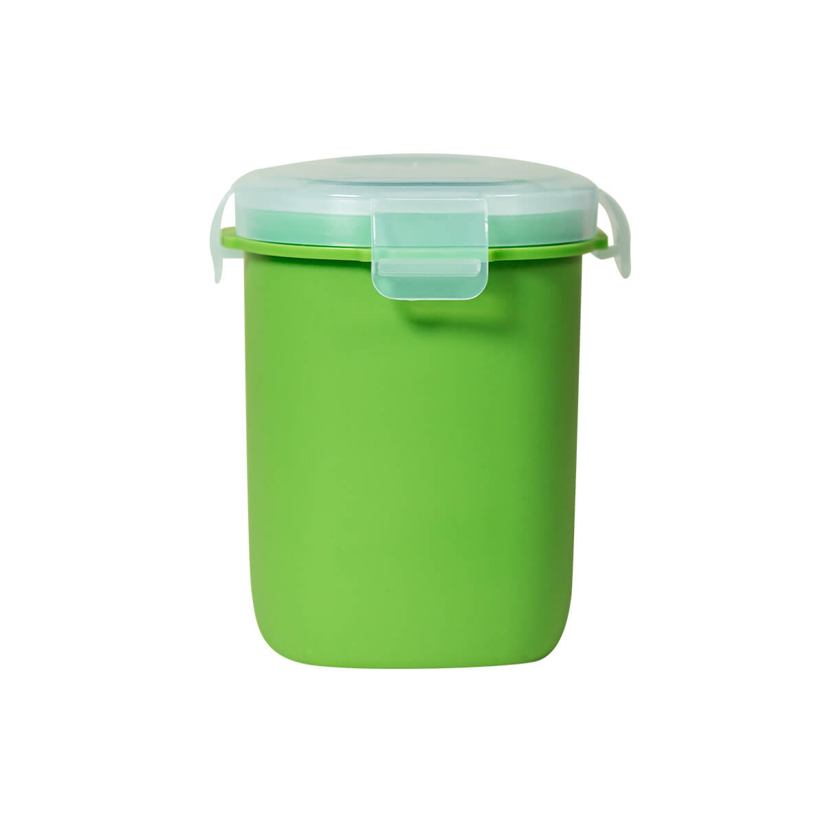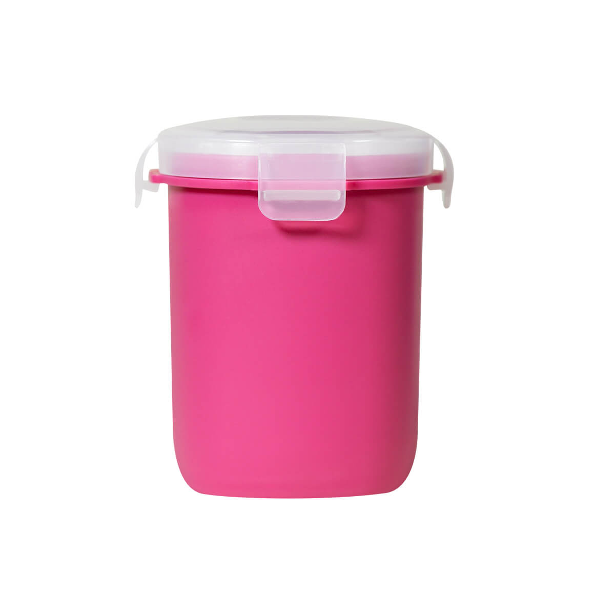 Vasito contenedor de plástico con tapa con cuatro pestañas y sello hermético para evitar derrames. Compacto y versátil, es perfecto para llevar tus snacks sin preocupaciones.