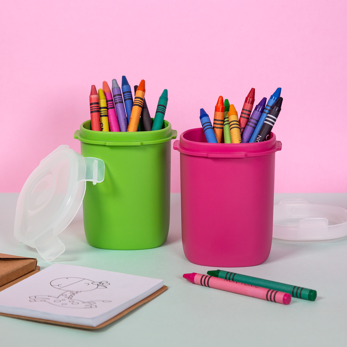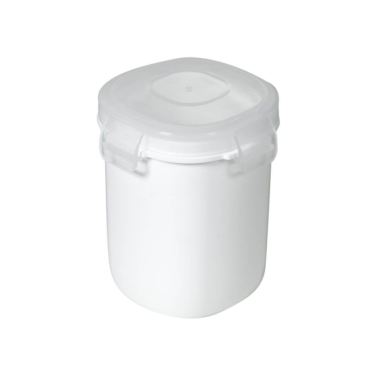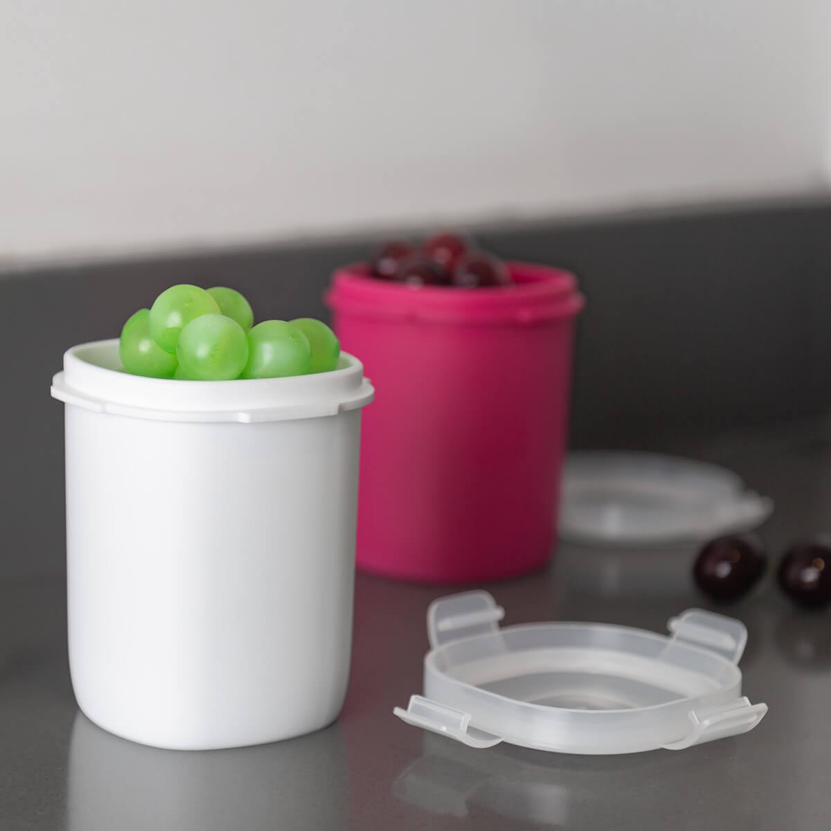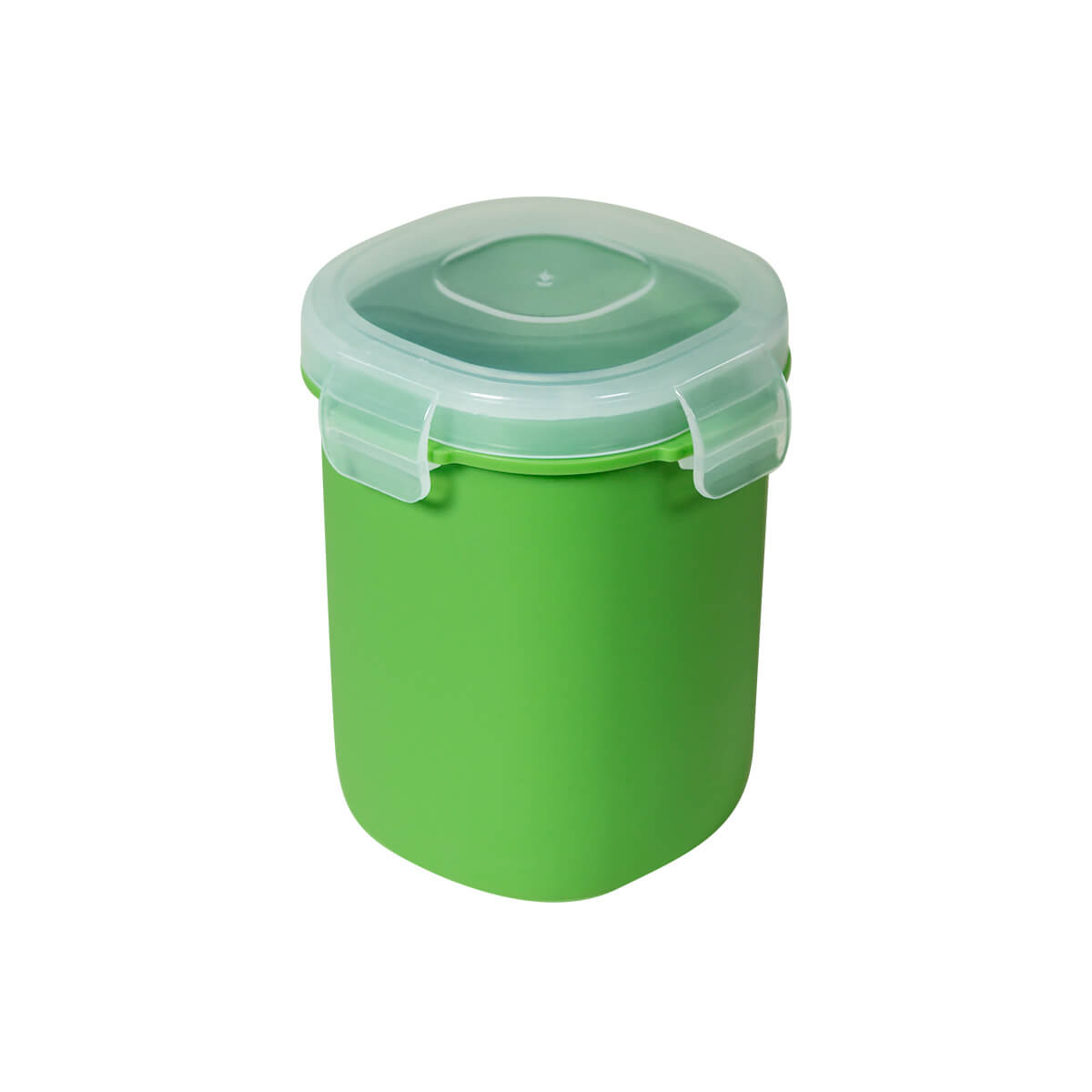 Vasito contenedor de plástico con tapa con cuatro pestañas y sello hermético para evitar derrames. Compacto y versátil, es perfecto para llevar tus snacks sin preocupaciones.