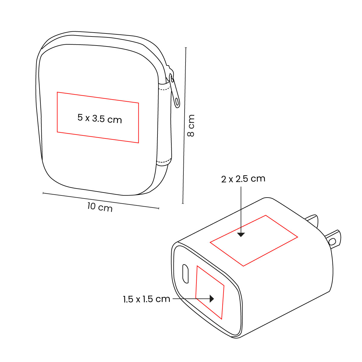 Incluye adaptador de corriente con puerto tipo C de carga rápida de 20W, cable auxiliar con conexión tipo C en ambas puntas y estuche rígido para transportar fácilmente los accesorios. – SET 015