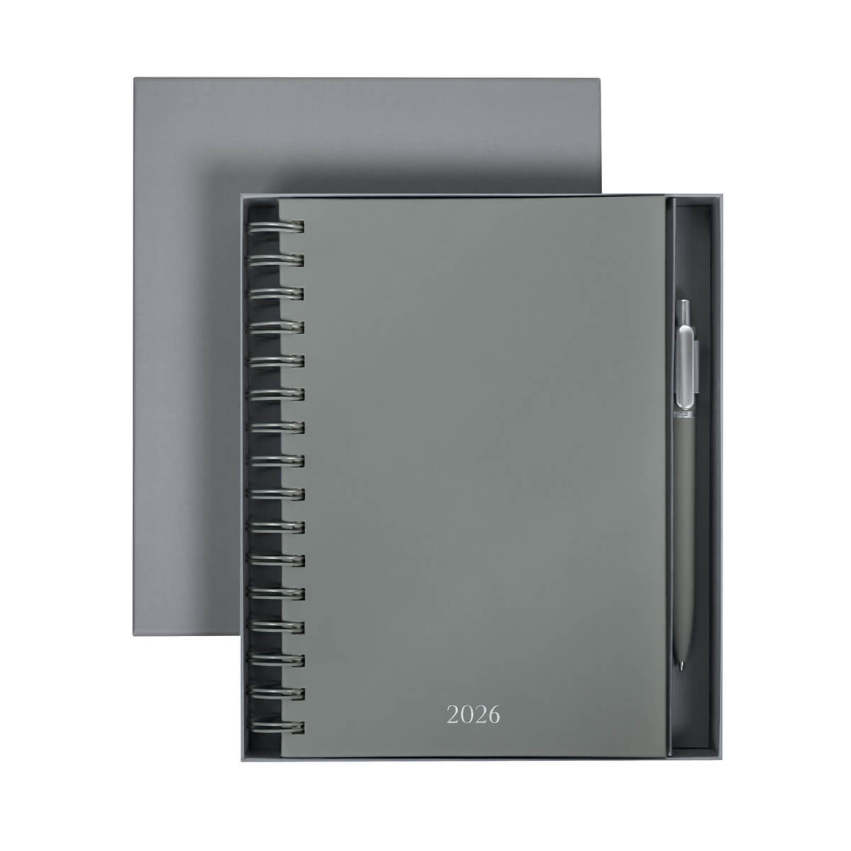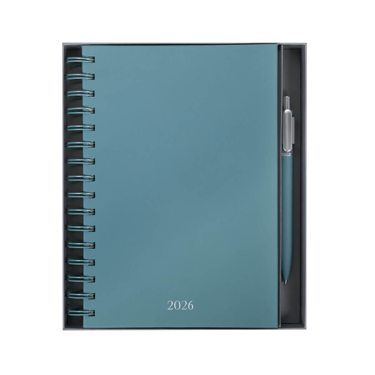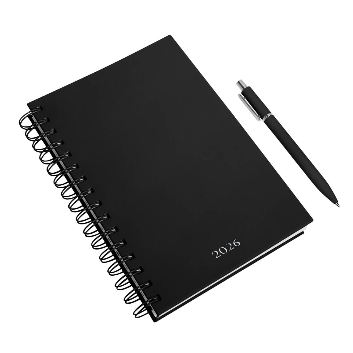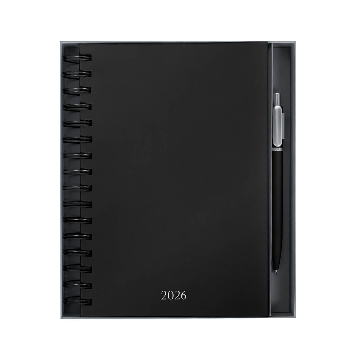 Agenda diaria con 174 hojas. Contiene datos personales, calendarios 2025-2026-2027, planeador 2026, seguimiento de nuevos hábitos y días festivos. Incluye bolígrafo metálico y caja individual tipo regalo. – AGSP 026