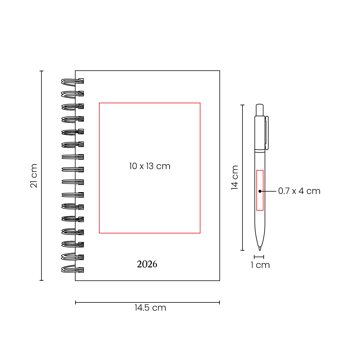 | Área de Impresión | 10 x 13 cm Agenda / 0.7 x 4 cm Bolígrafo |