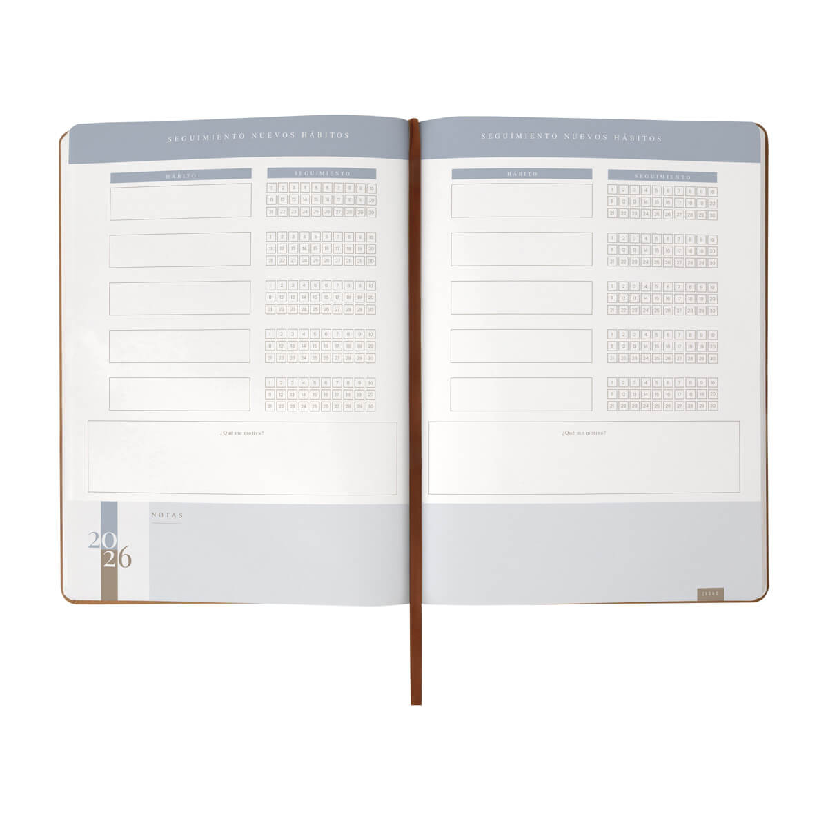 Agenda diaria con 174 hojas. Contiene datos personales, calendarios 2025-2026-2027, planeador 2026, seguimiento de nuevos hábitos y días festivos. Incluye caja individual. – AGDU 026
