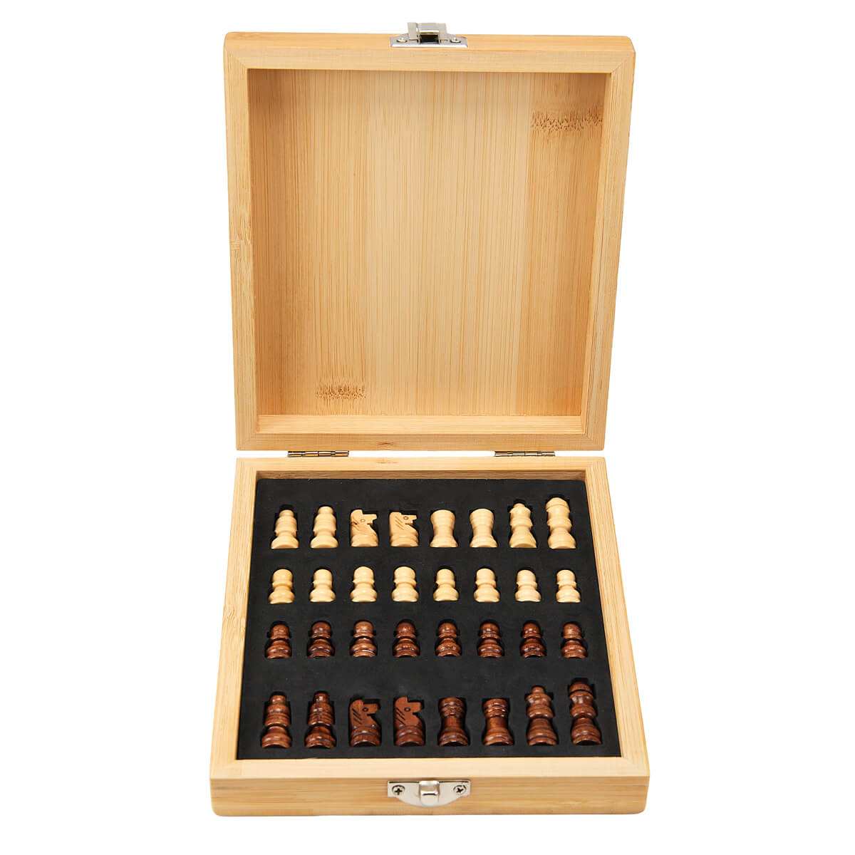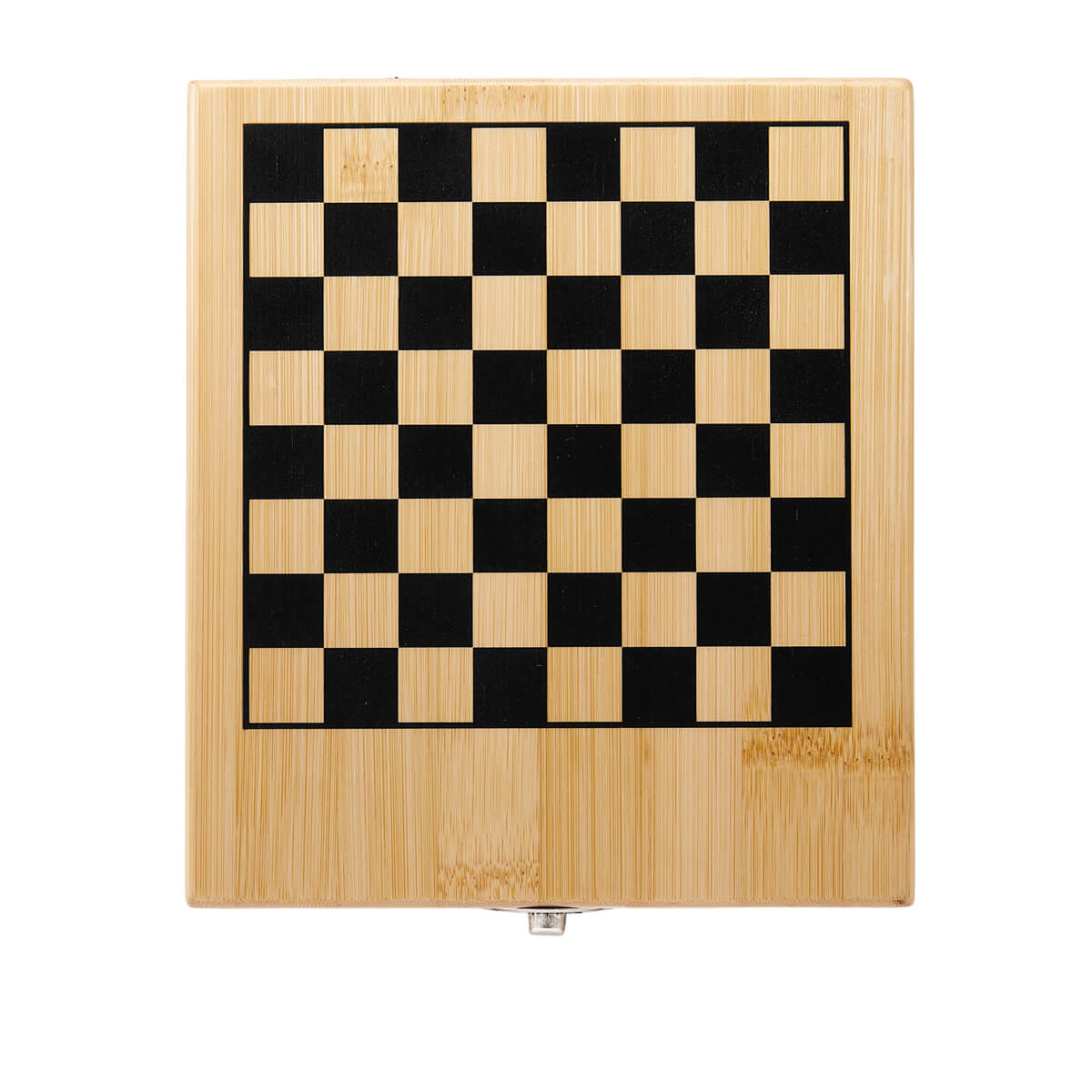 Fabricado en bambú, ideal para los amantes del juego estratégico que valoran la practicidad y el diseño. Incluye 32 piezas en dos tonos de madera (oscuro y claro), perfectamente proporcionadas y almacenables dentro de su propio estuche. El tablero está impreso directamente sobre la tapa del estuche, lo que permite jugar cómodamente y guardar todo con facilidad. Su broche metálico garantiza seguridad durante el transporte. La madera es un producto natural el cual puede presentar variaciones en tonalidades y vetas. Incluye caja Individual. – JM 015