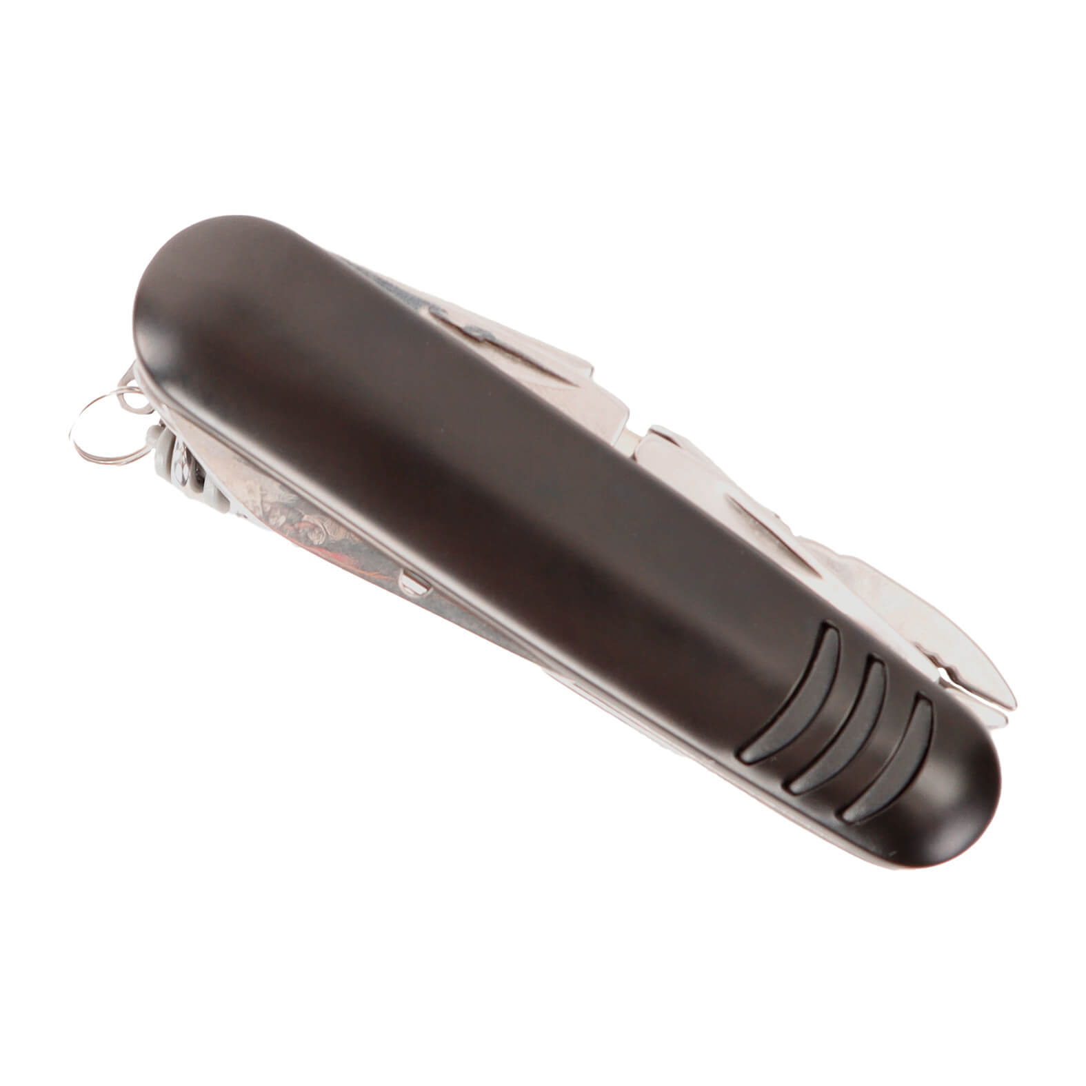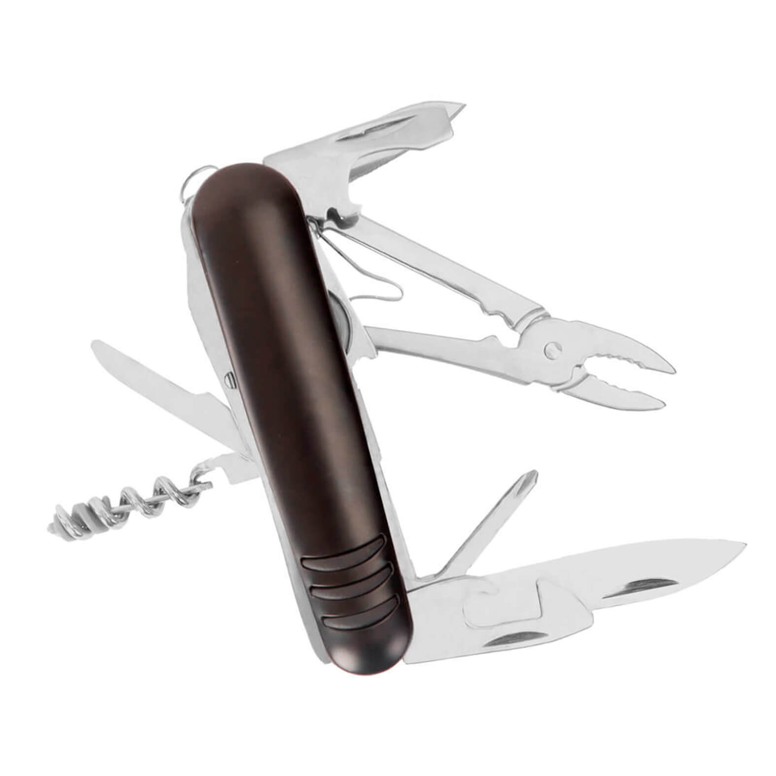 Navaja metálica multiusos con 21 funciones, entre las que destacan: sierra, destapador, abrelatas, tijeras, serrucho, navaja, sacacorchos, lima y desarmador.