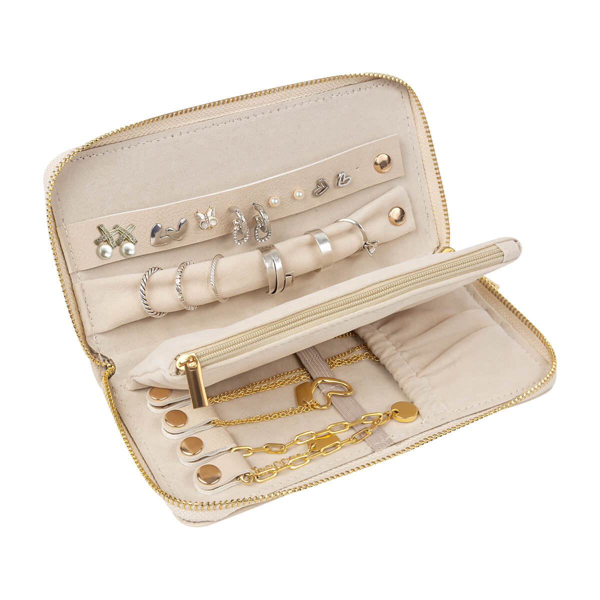 Organizador de joyería para viaje con diseño tipo cartera. Cuenta con múltiples compartimentos internos para organizar anillos, aretes, collares y pulseras, incluyendo ganchos metálicos, bolsillo con cierre y bandas con broches. Cierre completo y formato compacto para llevarlo en bolsa o maleta sin ocupar mucho espacio. – DAM 046