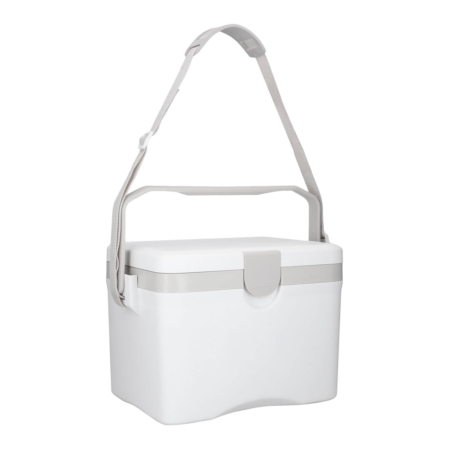 Hielera plástica de doble pared insulada al vacio con separador, broche de seguridad, asa superior y correa ajustable.