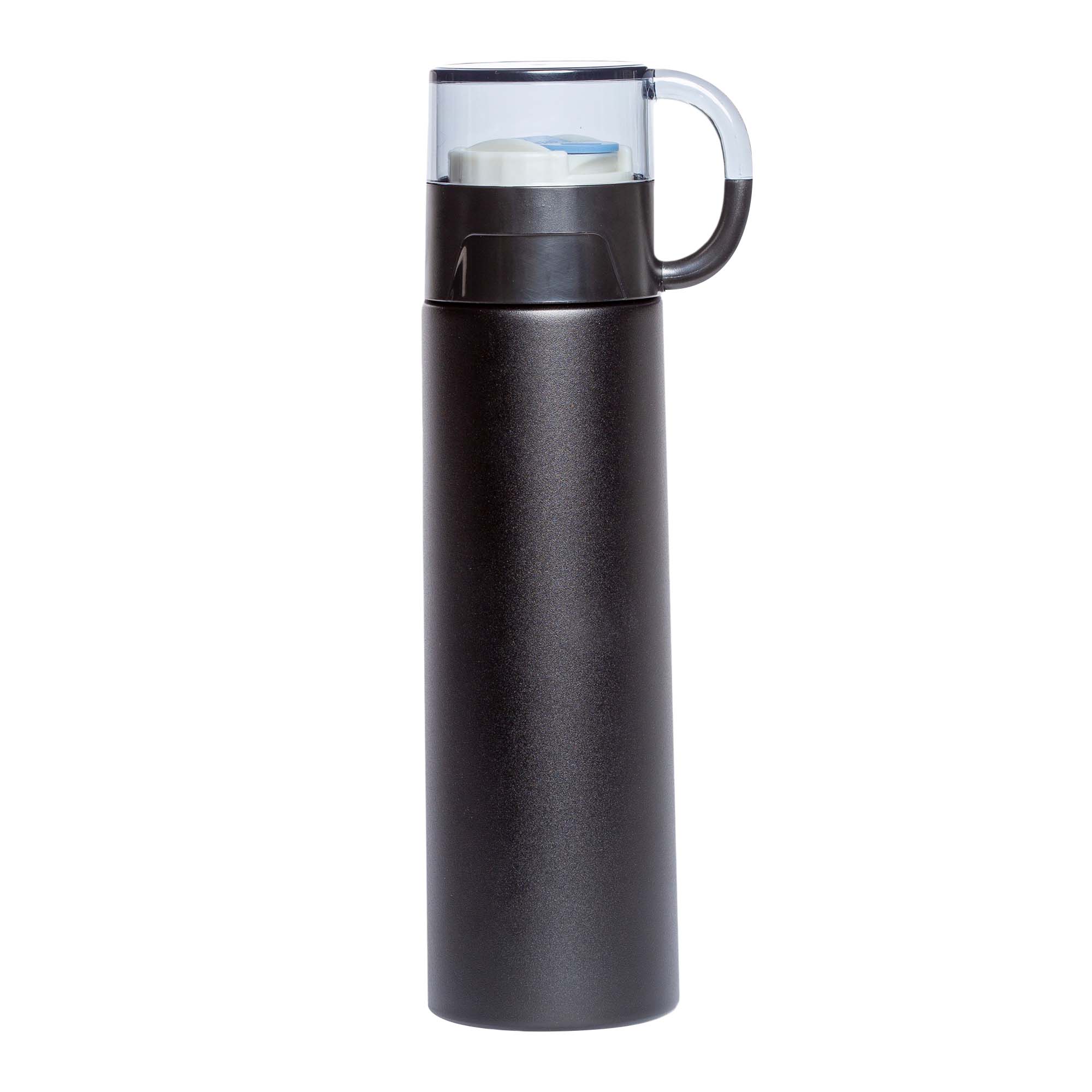 Termo de acero inoxidable, insulado al vacío, con tapa que sirve como taza.