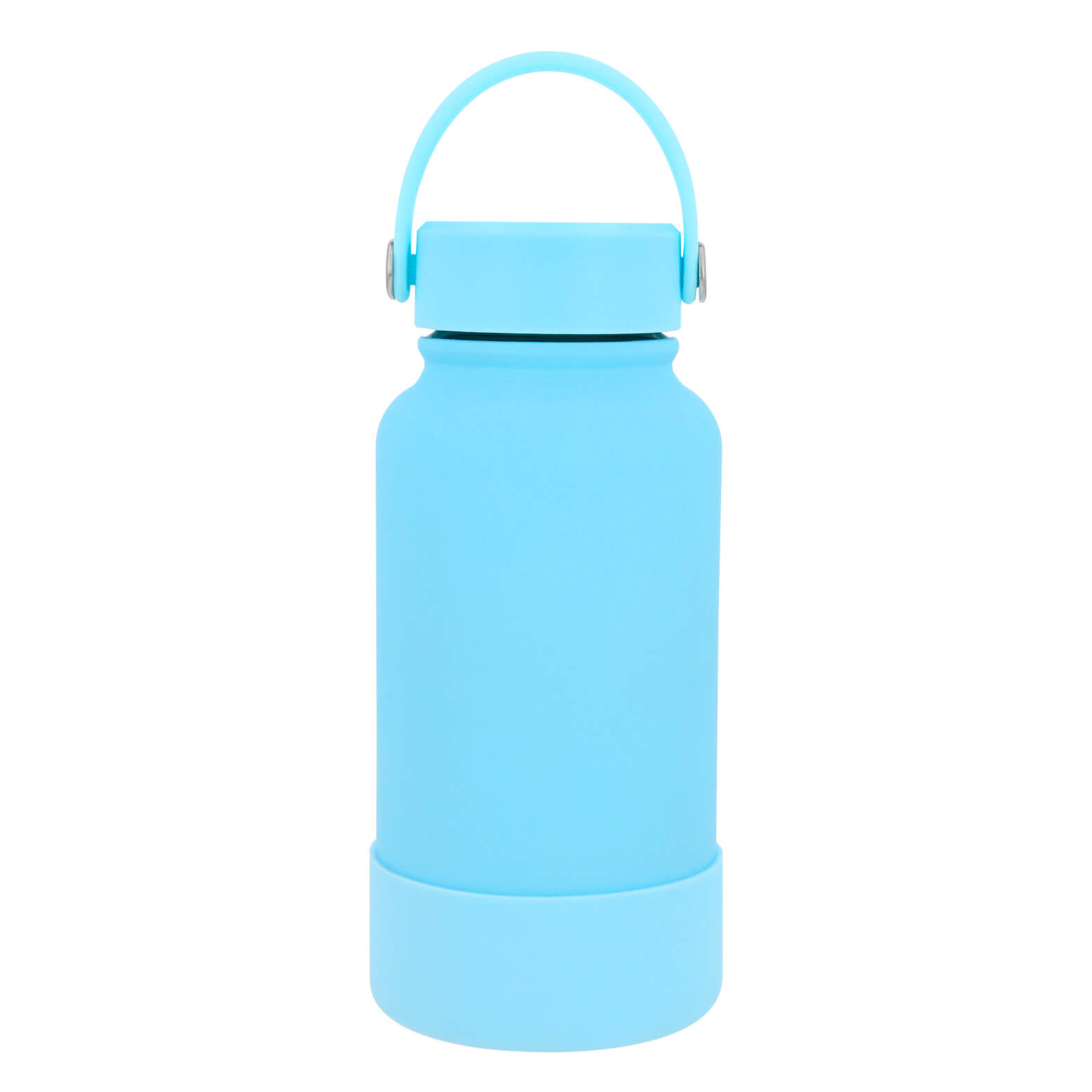 Termo con doble pared de acero inoxidable, insulado al vacío, acabado rubber con silicón en la parte inferior y tapa enroscable con asa.