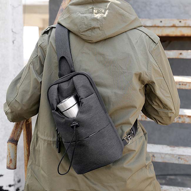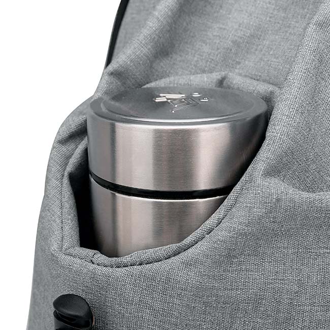 • Compartimiento frontal para guardar bebidas con cierre en jareta ajustable.