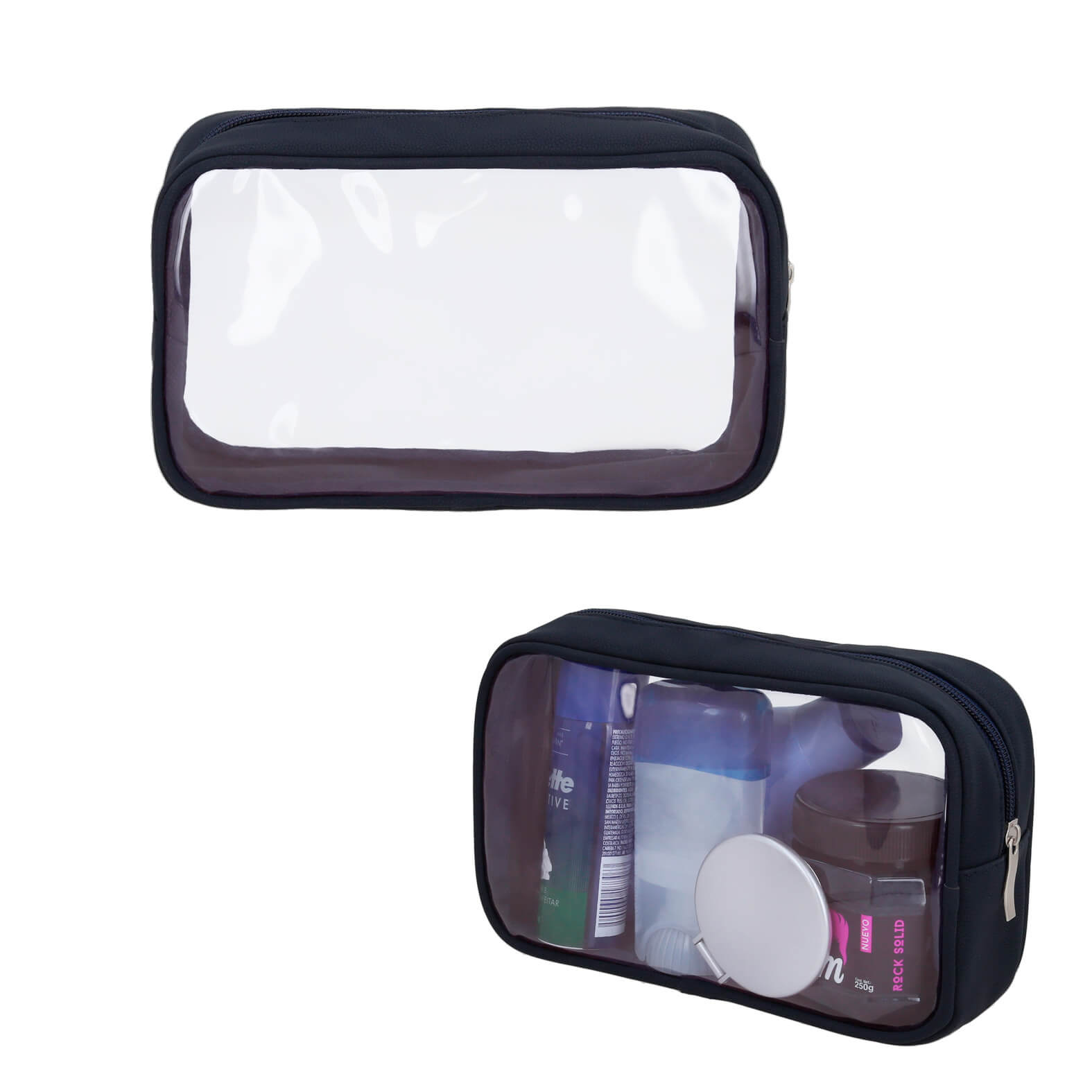 Neceser de viaje con plástico transparente, cierre y fuelle.