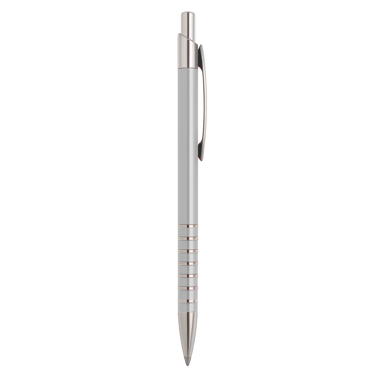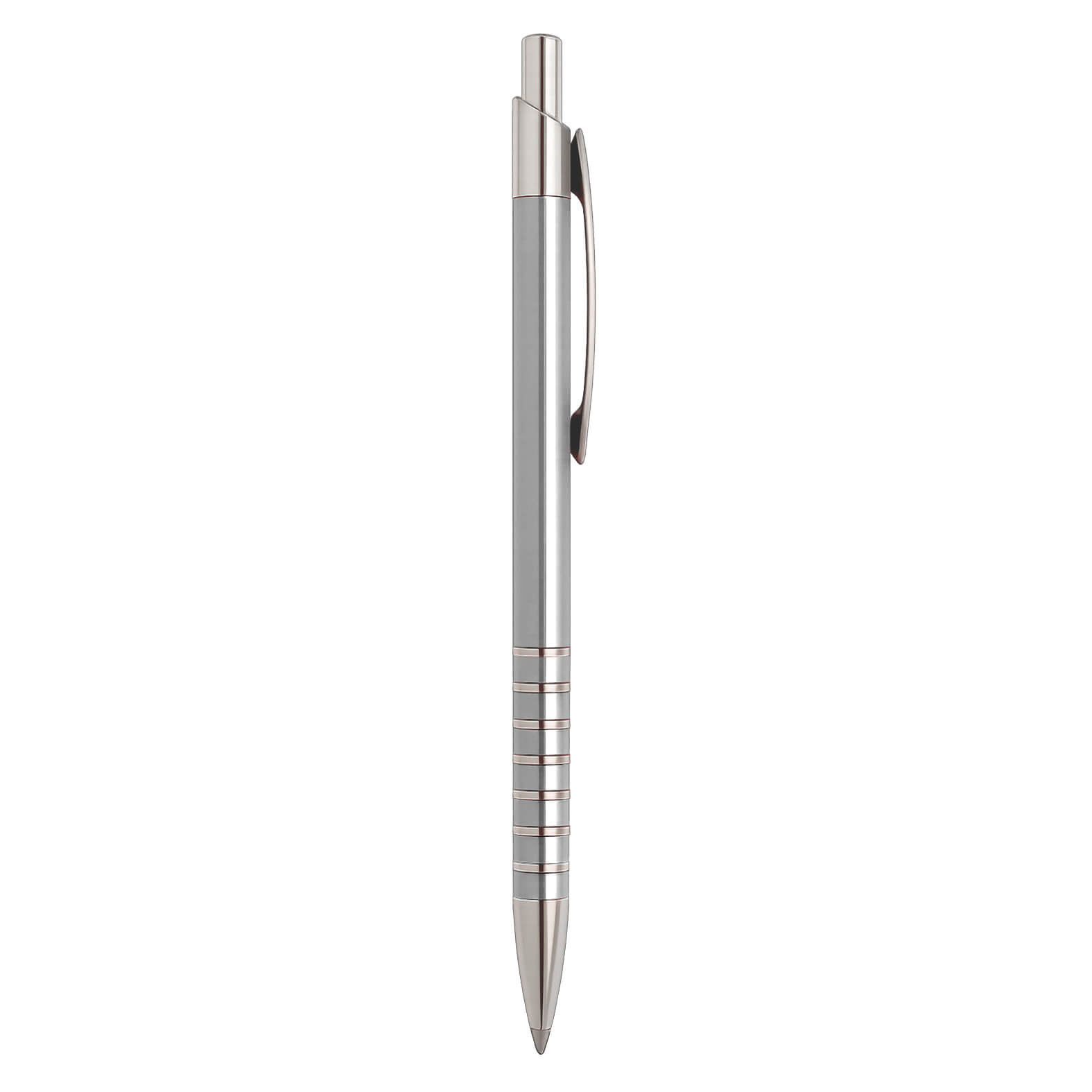 Bolígrafo de aluminio con clip metálico y mecanismo de click.