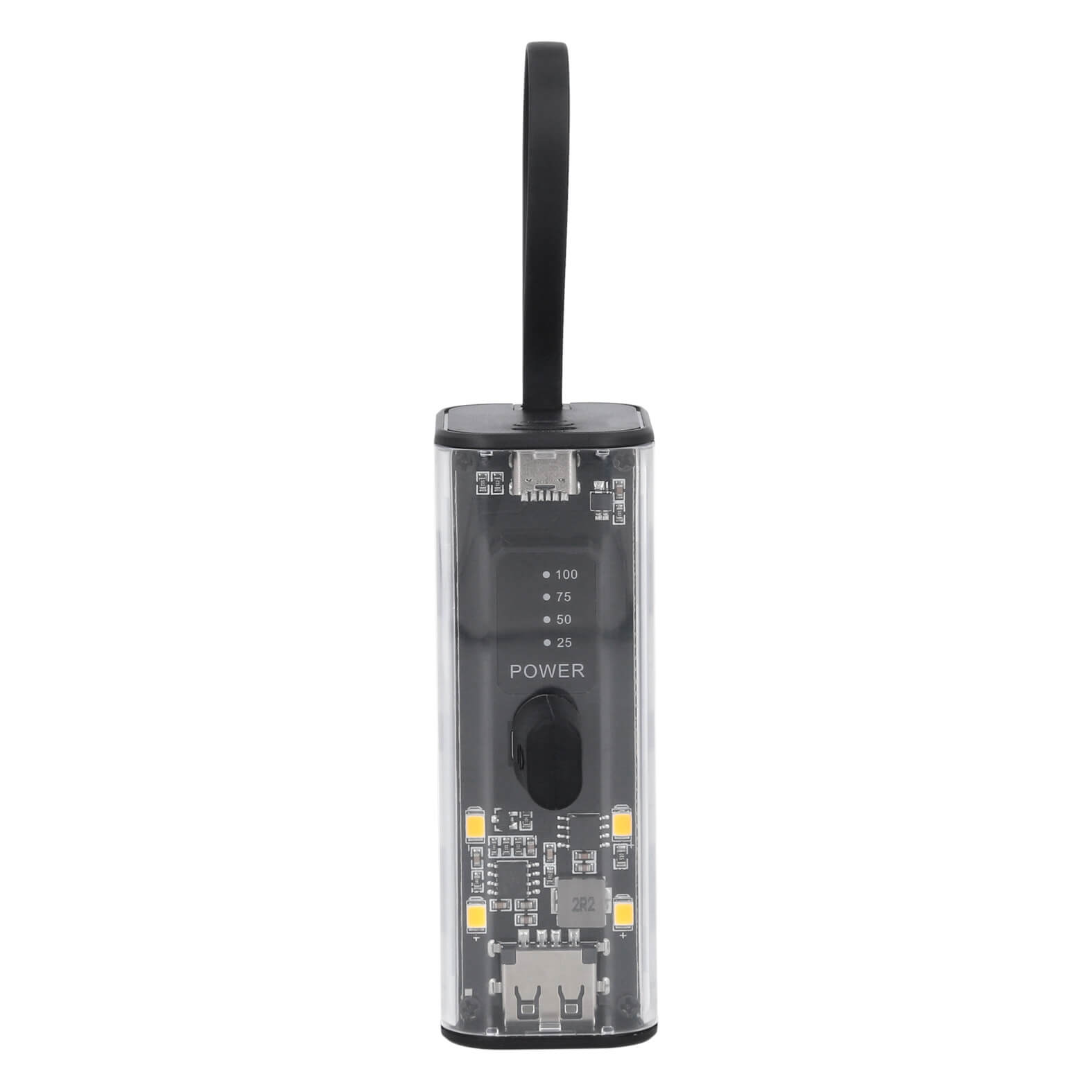 Power Bank transparente de 5,000 mAh con salida y puerto tipo C, 1 cable lightning, 1 cable y puerto USB.