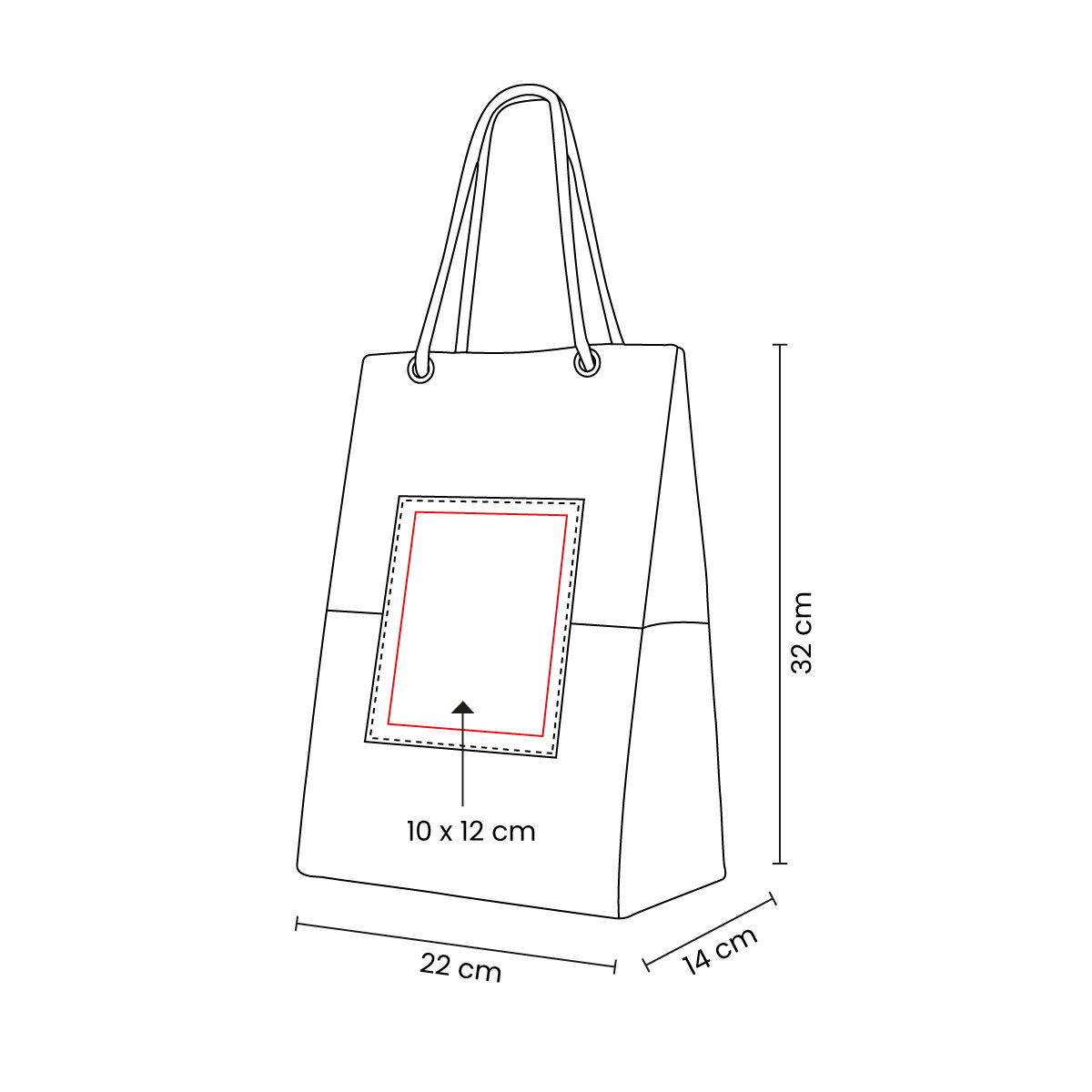 Bolsa con interior laminado y asas de cordones de algodón. Diseño en dos colores contrastantes. Parche frontal para impresión.